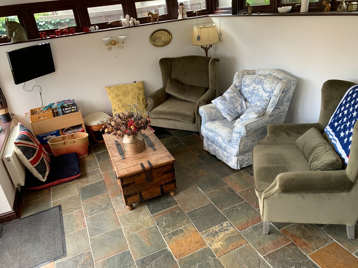 The view at the back of my house at breakfast time is spectacular. You are assured of a restful night's sleep because my house is in a quiet cul de sac. The room also has a TV, hairdryer and unlimited tea/coffee available free of charge. In the summer you can either sit in the Conservatory or on the terrace after arrival, to enjoy the wildlife of birds, squirrels, foxes and cows. The conservatory is available as a very relaxing workspace . Power shower as well as hand held shower in private bathroom. Free parking in the road outside the house.