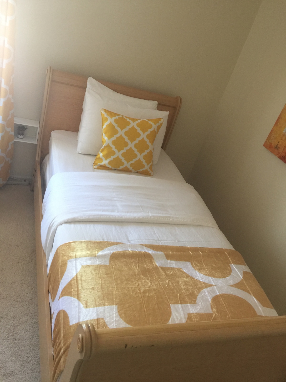 The bedroom includes a couch, two twin beds with mattress toppers, and 4 pillows (Sealy Sterling Collection Down-Alternative Pillow, and memory foam), and duvet. The window includes black-out curtains.