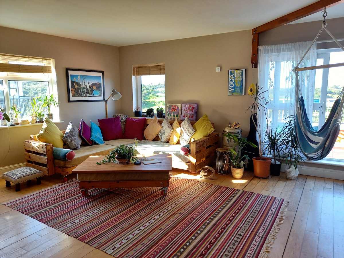 The furniture is designed and built from scratch, reinvented, up-cycled and hand made. Open space living area with a beautiful and unique dinning table made from precious vintage wood. The corner sofa which opens into a queen size bed (can sleep very comfortably 2 adults or 3 children) is also hand made with care and attention to details. A hammock is hanging from the ceiling facing the bay; this could be the perfect relaxation spot, read a few pages or just watch the sky and the birds or the flow of the water during the tides. The bedroom has a double bed with a very comfortable mattress and an open way to store your clothes. Everything is self made, hand crafted or refurbished. The kitchen is fully equipped, with oven, hobs, extractor fan and all of that jazz just waiting for you to cook yummy dinners. The bathroom has electric shower and fan.