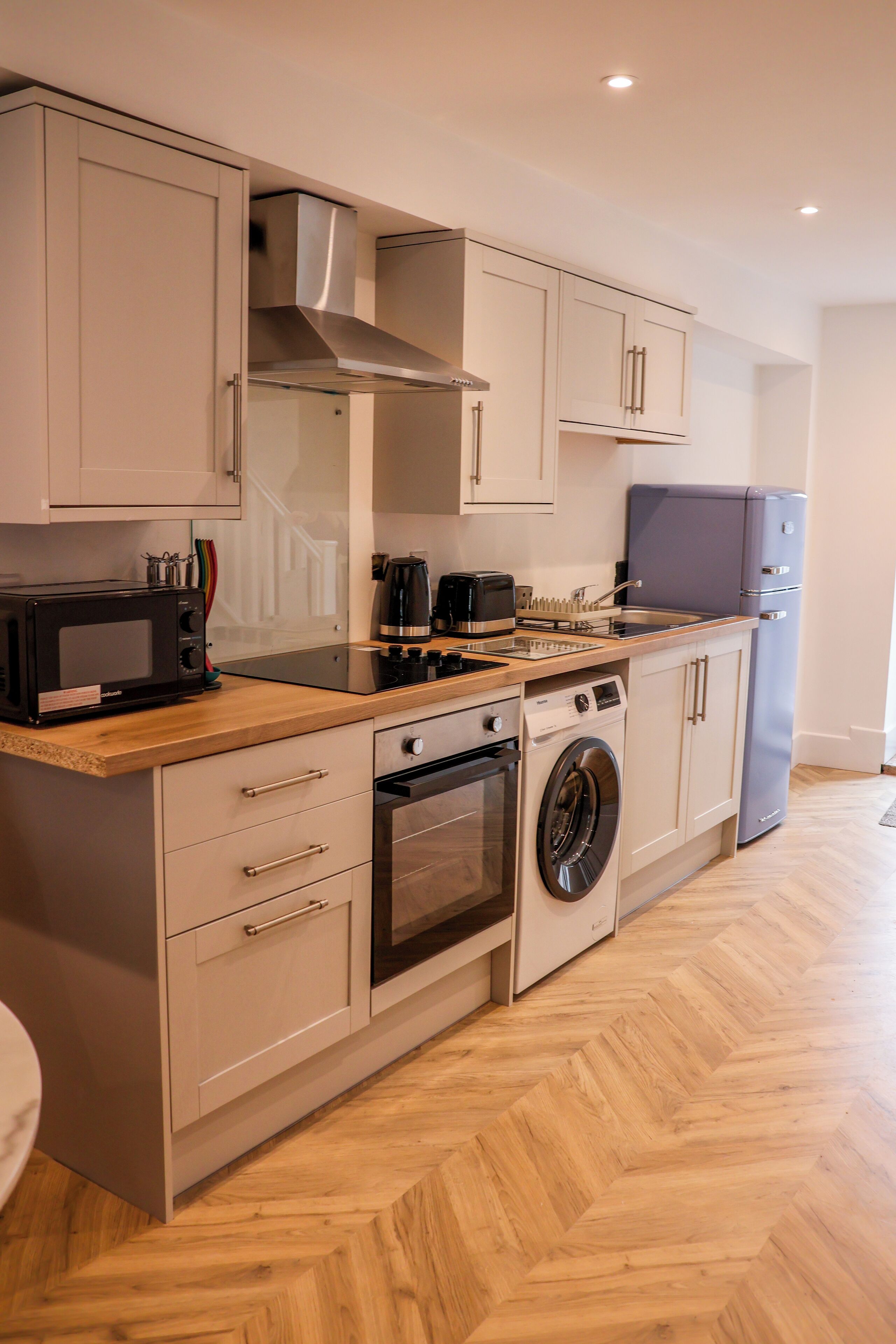 The professional kitchen includes, a large double fridge/freezer with ice and chilled water function, combi microwave/oven/steam oven, dual temperature wine fridge, induction hob, ESSE range cooker, dishwasher and instant boiling water tap. Our cupboards are full with all you’ll need to make use of this incredible space, from baking a cake to a more formal dinner party.