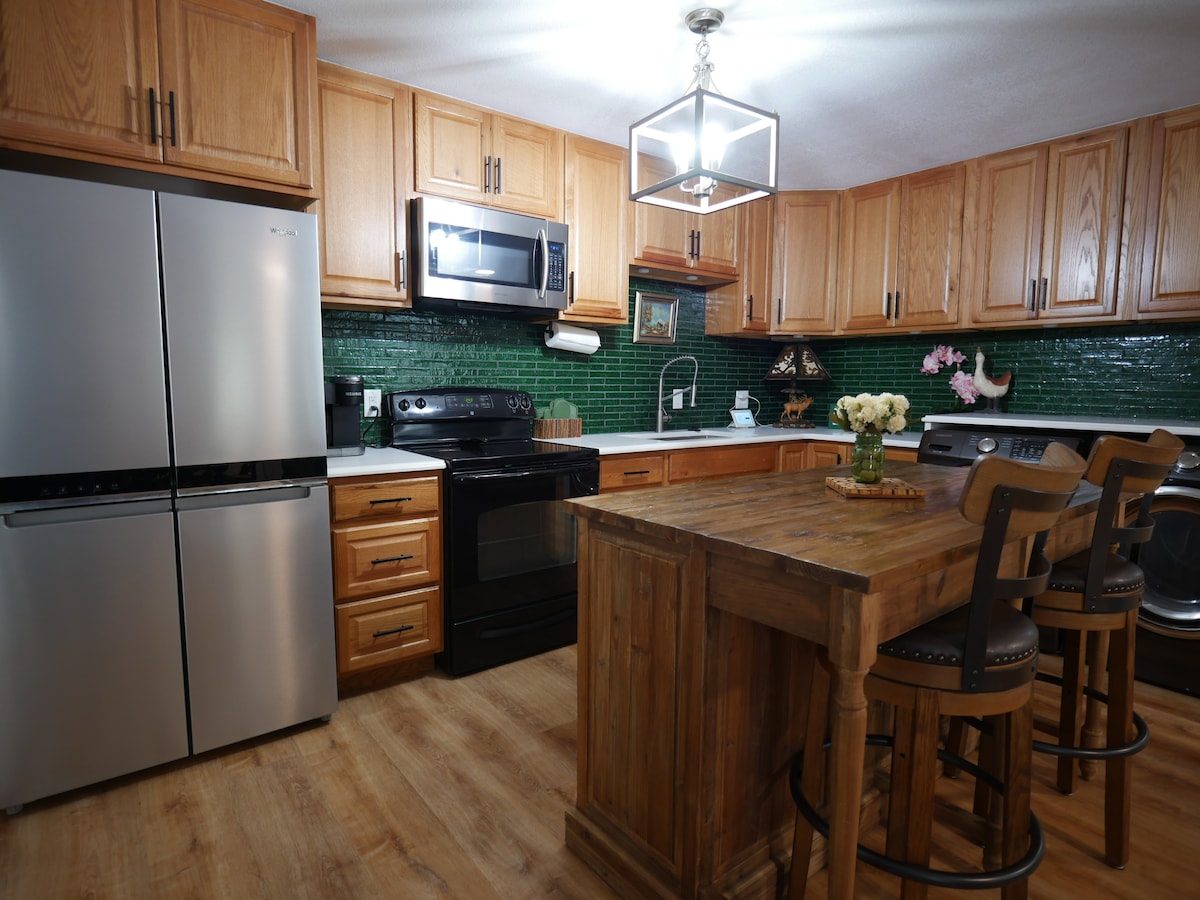 After an adventure-filled day, there is no better way to refuel than preparing a carbohydrate-filled feast in the fully equipped kitchen with a 4-burner gas stovetop, two ovens, microwave, and all the necessary cooking utensils. Enjoy your meal at the wooden dining room table while gazing through the windows at the beautiful pine and aspen trees.