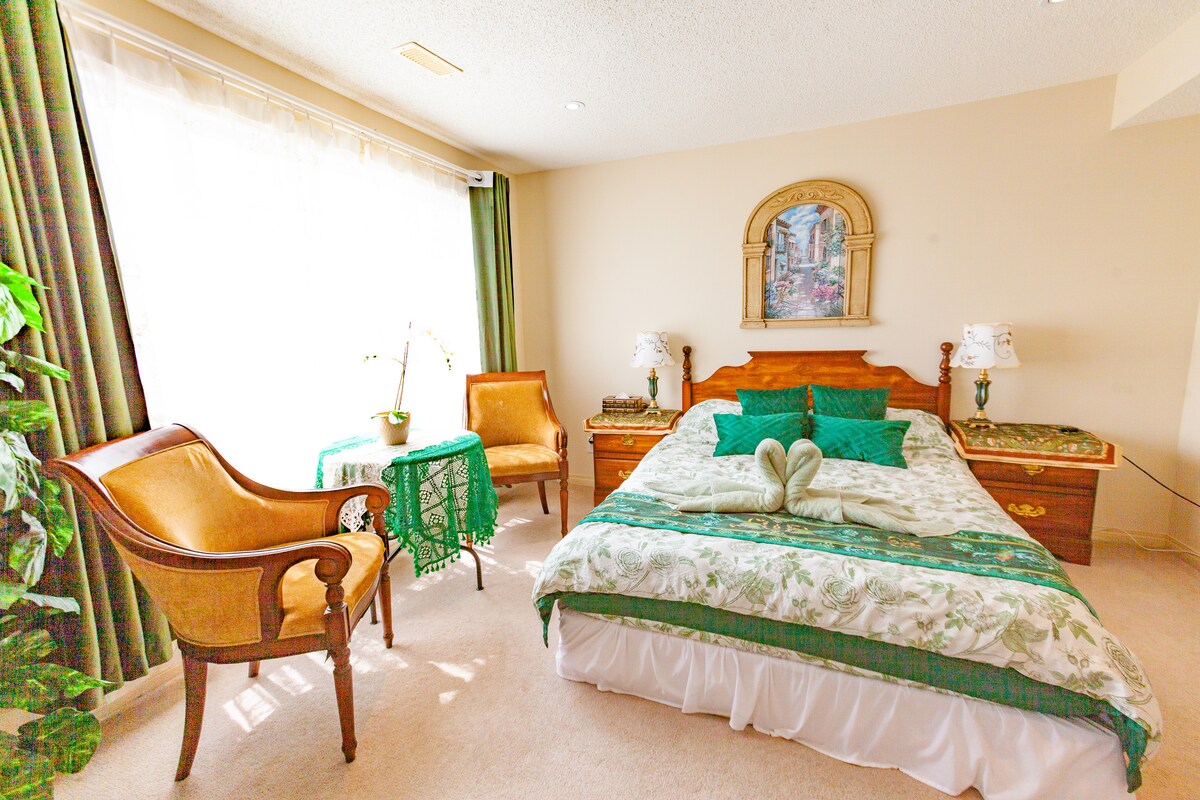 This is an spacious brand-new Basement suite with high ceilings. It comes with a sofa bed on the living room, smart 55” TV with Netflix, Amazon Prime Video, Youtube etc, fast wifi with dedicated workspace, dining table and chairs, fully equipped kitchenette with coffee maker, toaster, cooking essentials, kettle, microwave and more. The bathroom includes a bathtub, hairdryer and complimentary towels, soap, shampoo, conditioner and body lotion. The Bedroom has a queen-size bed, comfy pillows, blanket/duvet, nightstands, lamps, blackout curtain, iron and large closet with hangers. Everything is brand-new with western-themed decor in a very quiet and family-friendly neighborhood. We’d love to host you 🥰