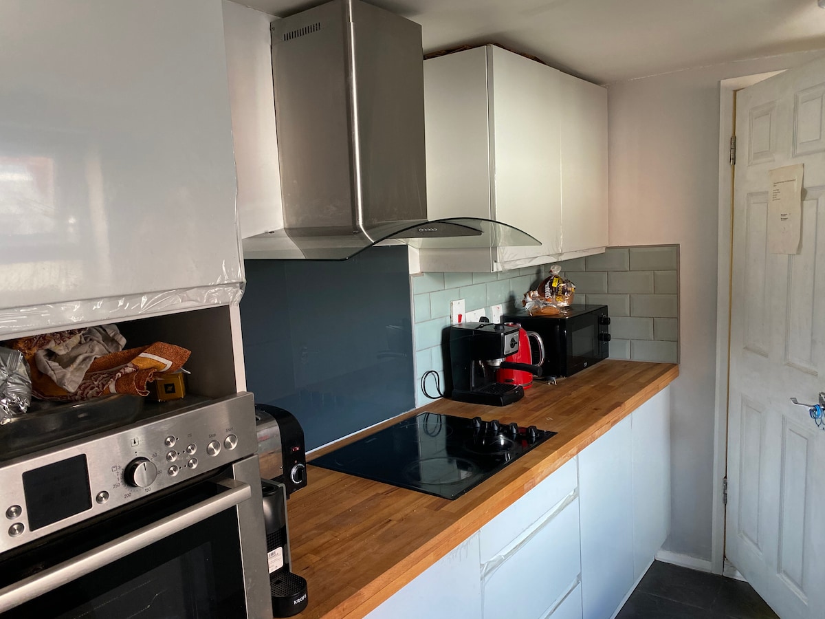 Quiet and peaceful location ideal for a single person or couple to use as a base to explore the surrounding area. A small kitchen area equipped with combi oven/air fryer, induction hob, kettle, microwave, fridge/freezer, toaster, pans, cutlery, mugs and plates for 2.