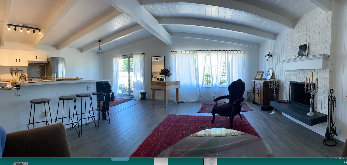 It has a large and bright kitchen! There is a dining room table with chairs for four. Then there is a livingroom with couch and tv. Please note there is no fires permitted in the fireplace. Then there is a large bedroom with king sized bed, two end tables, desk with chair and dresser. There is a laundry room with washer and dryer. There is a bathroom with shower and toilet. The second bedroom is the quietest and has two sitting chairs, dresser and king sized bed.