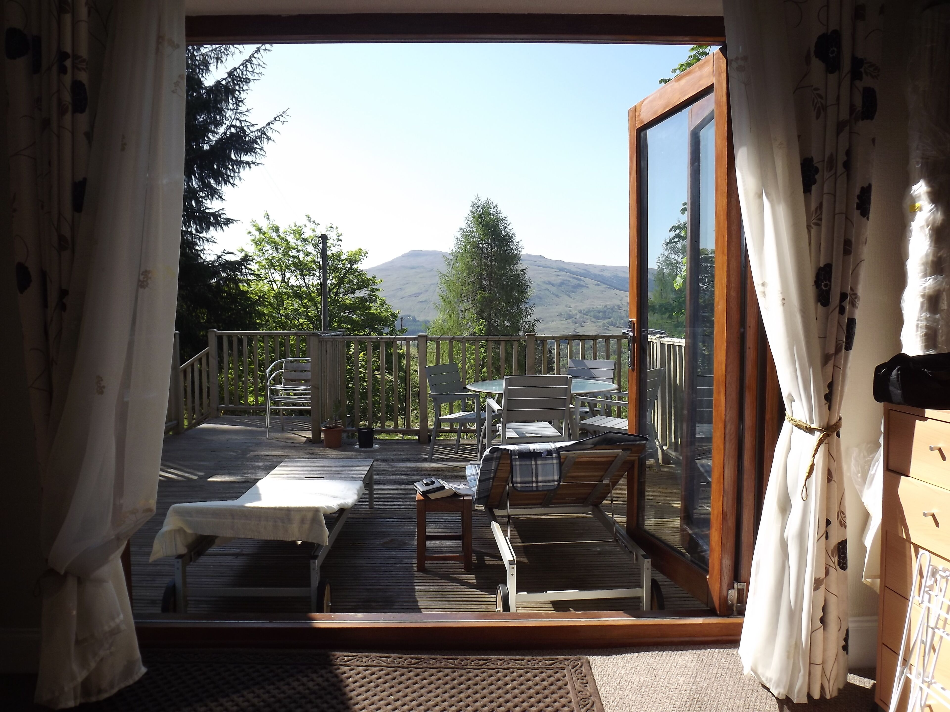 French doors lead to the living room with a large sliding door out to a private patio with garden furniture offering unrestricted views over Loch Dochart and its castle ruin, the rugged and dramatic Glen Dochart, the famous munro Ben More and the surrounding mountains. A truly magnificent Highland setting and a view that will be hard to beat from a self catering holiday cottage in Scotland.