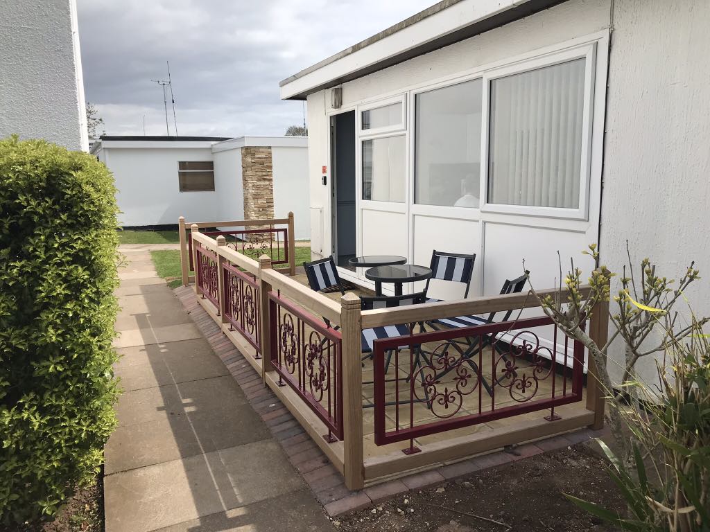 To access the caravan, you step onto the decking, which features a gate to ensure the outdoor space is secure and includes comfortable outdoor seating.