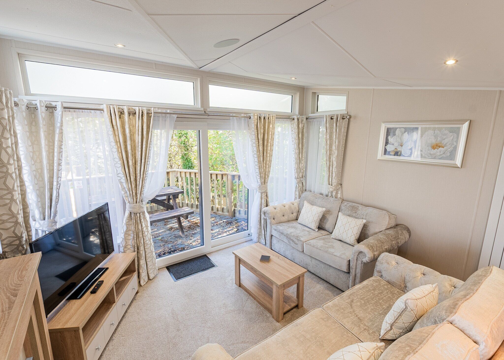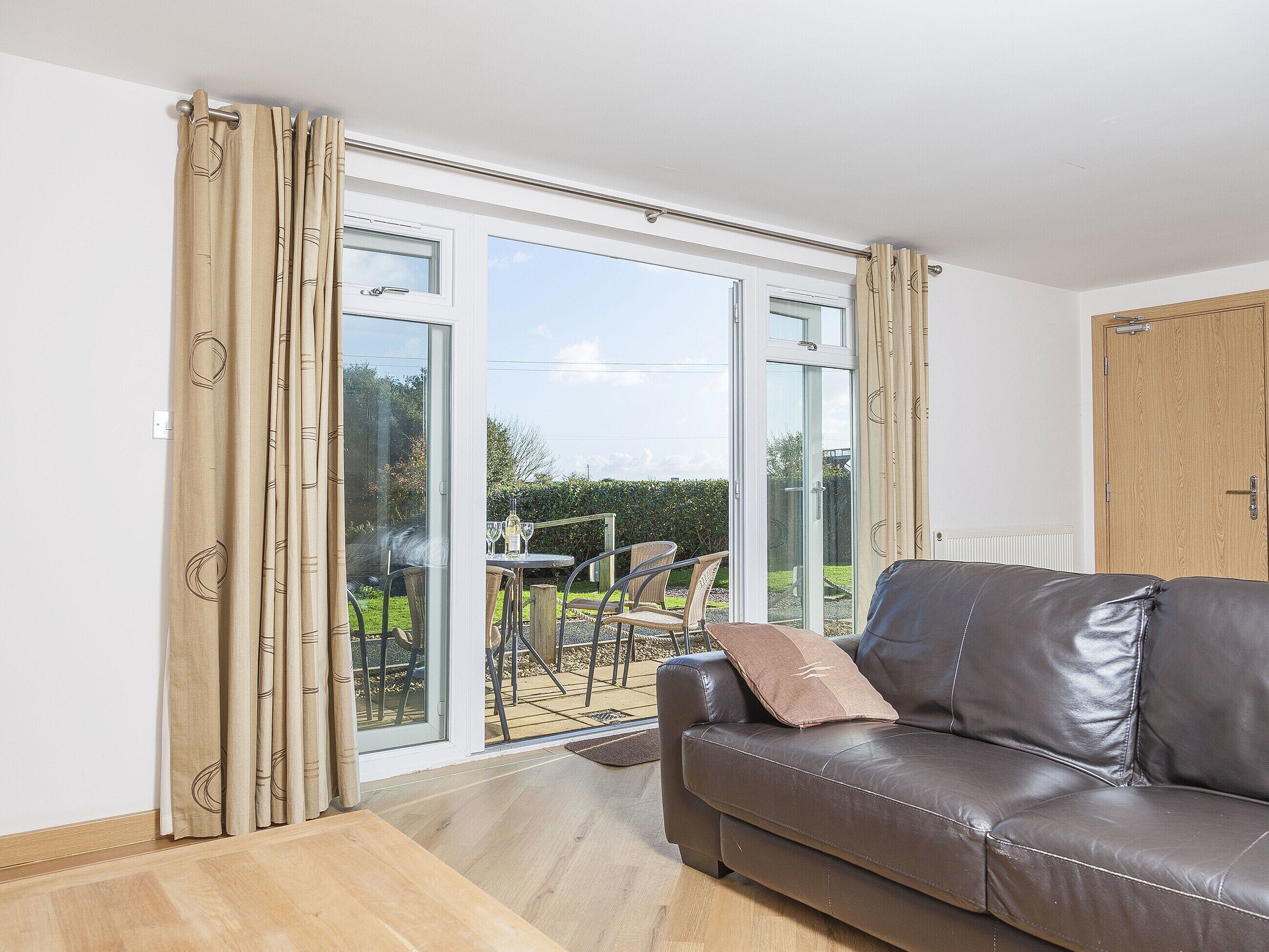 The lounge features a wooden floor with a patio door that opens onto a private decking area, complete with a gate and outdoor furniture.
