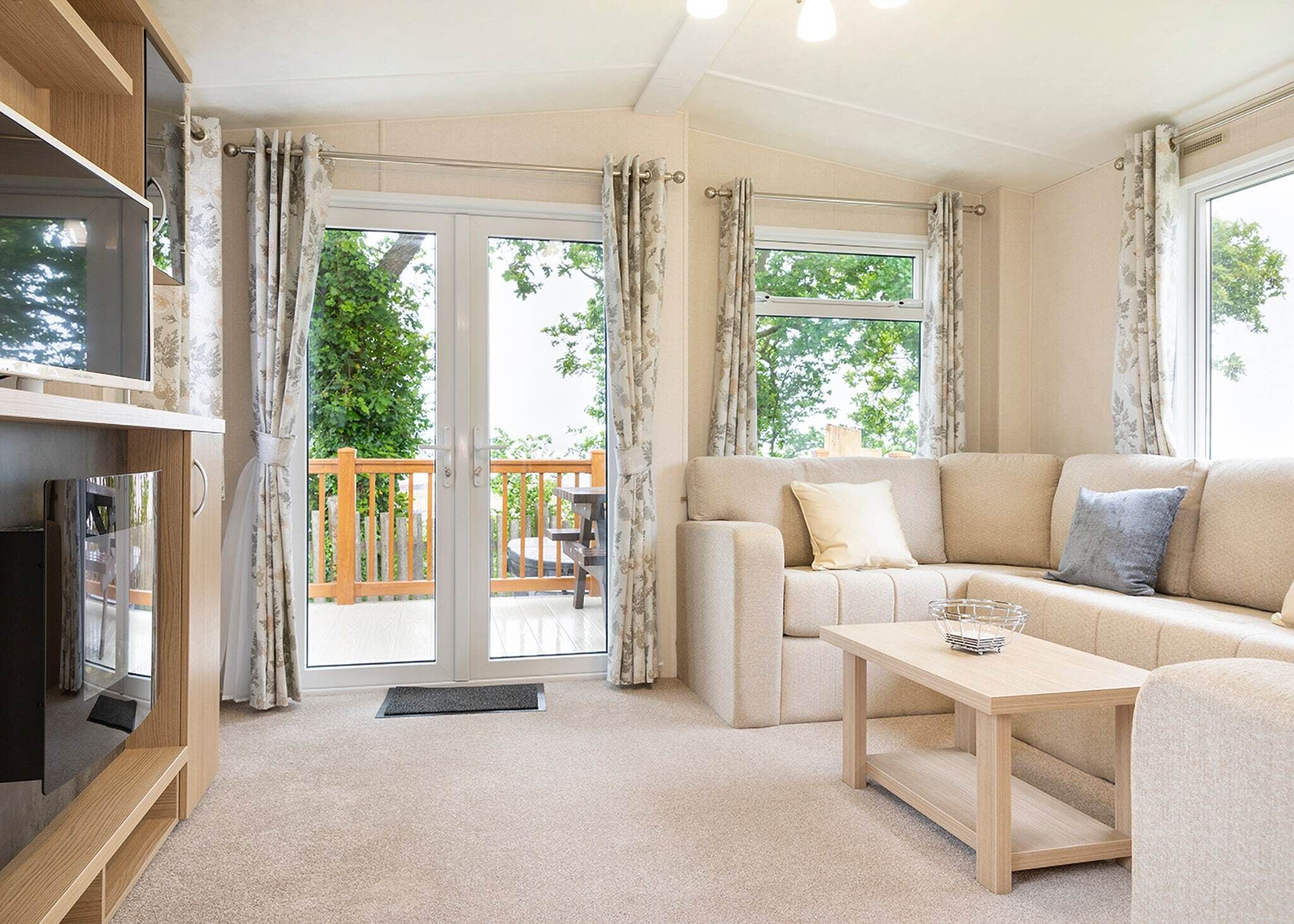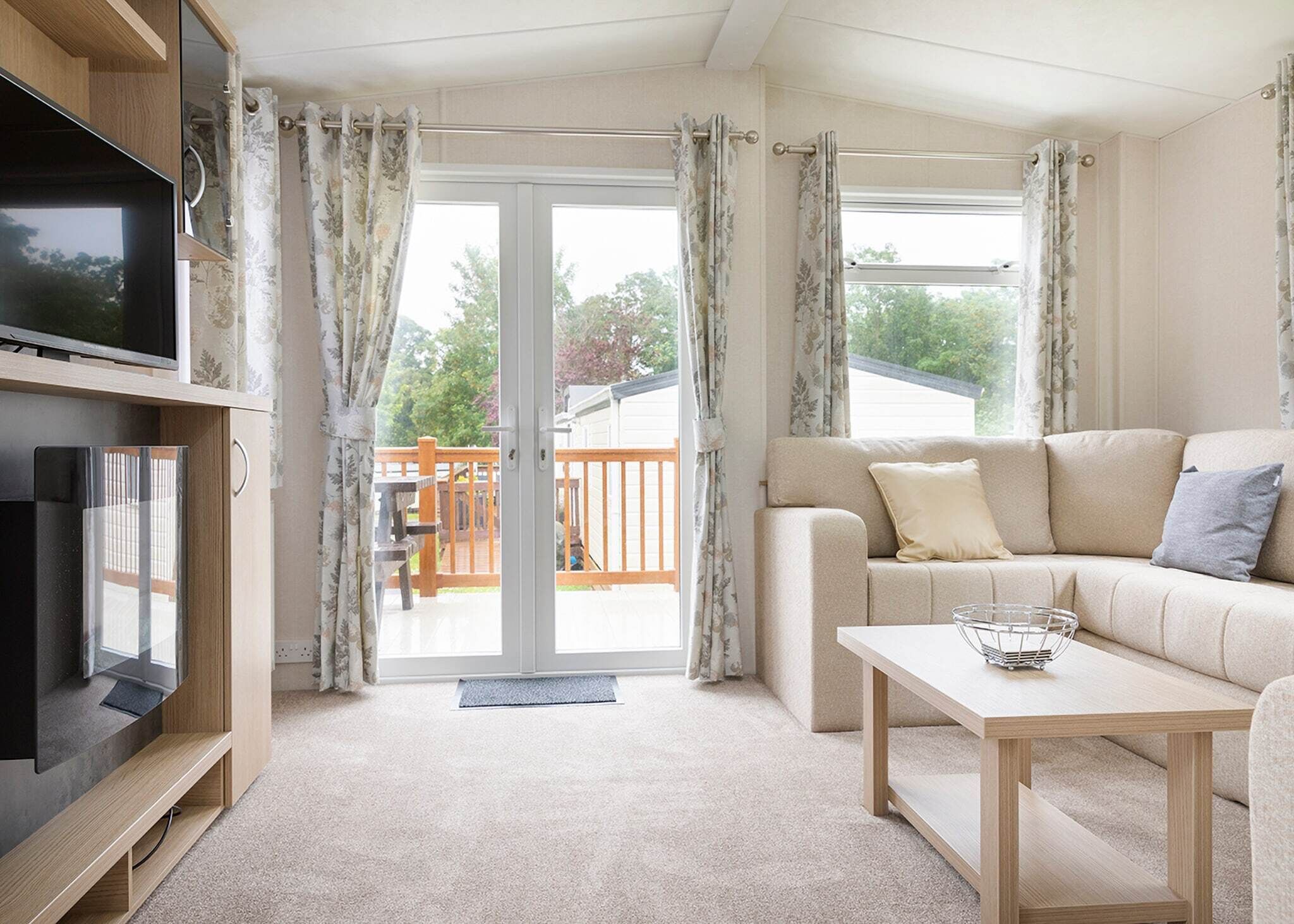 There is an outdoor deck at the front and side of the caravan, complete with furniture for enjoying the outside space.