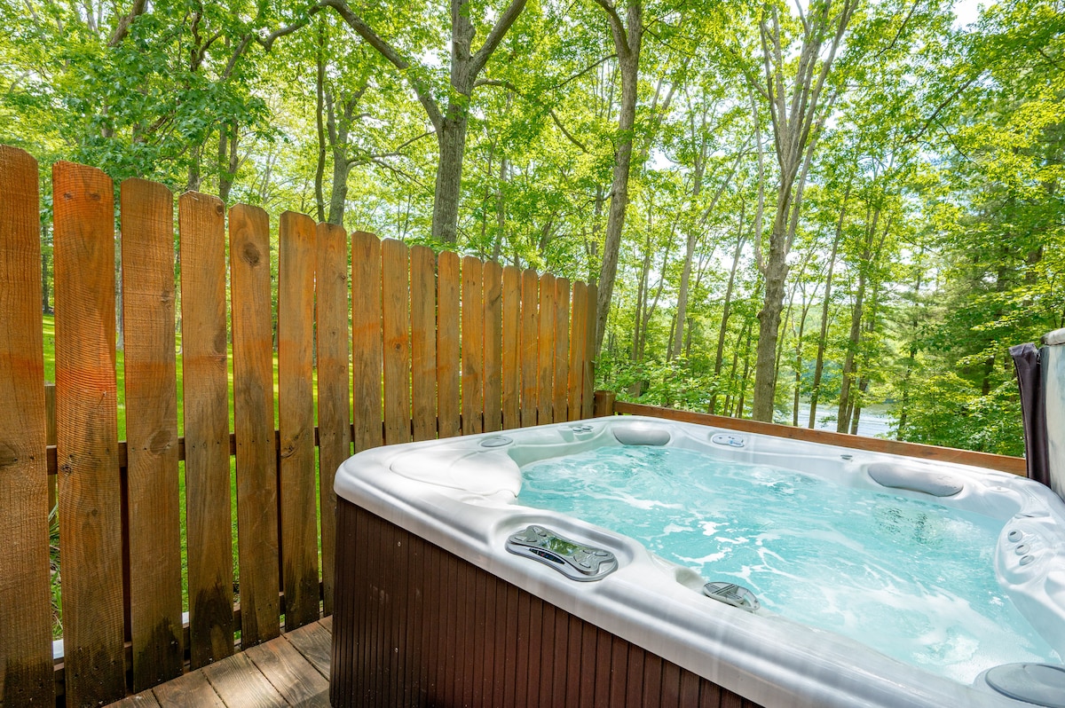 Lakefront home with dock slip + private hot tub.