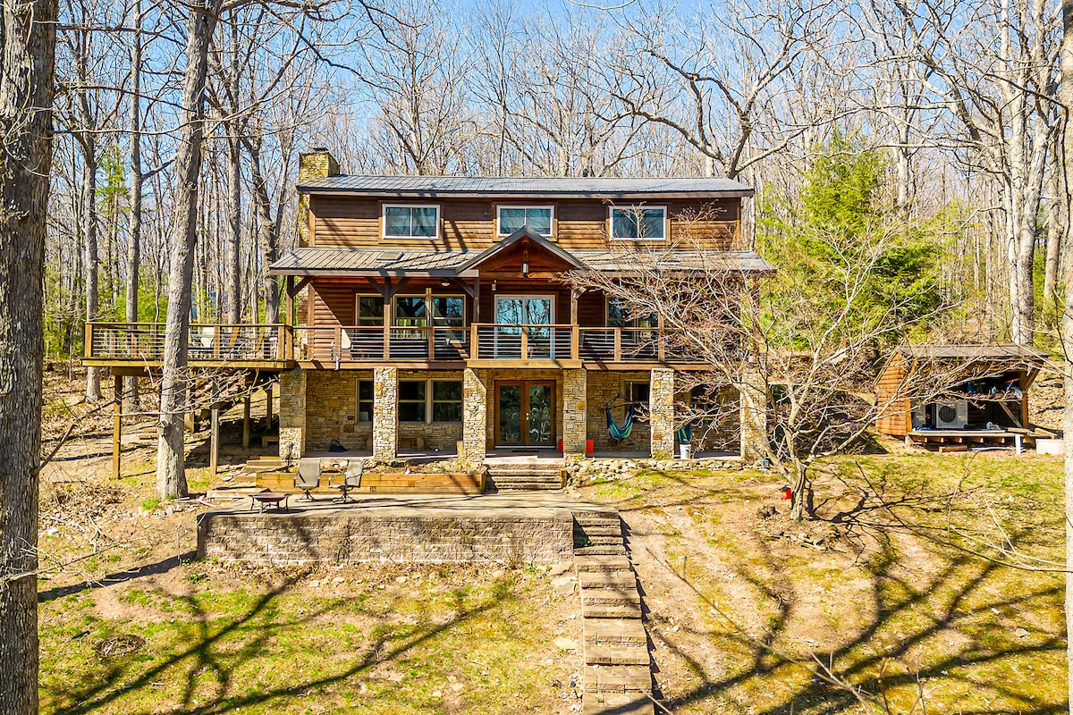Pet friendly log home with scenic views, fire pit, and creek.