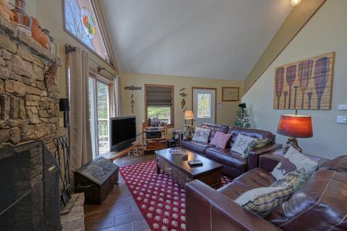 Highlighted by cathedral ceilings, the great room is filled with natural light that pours in from a wall of windows. Comfort and style come together to make this an inviting space to watch TV. The wet bar with a mini fridge ensures you won't miss a second of the big game when you need snacks or drinks. Everyone will appreciate the warmth of the beautiful stone fireplace ~ especially after a day on the ski slopes!
