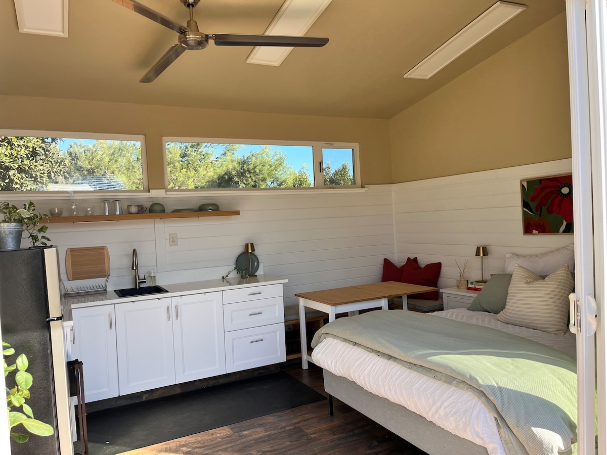 Part of a handcrafted home designed to bring affordability and artistic flair to Del Mar, Surfer’s Delight is one of several private suites arranged in a row to resemble a cluster of cozy beach bungalows. Each suite has its own entrance and distinct personality, offering the privacy of a standalone cottage with the warmth of a shared, lived-in space.