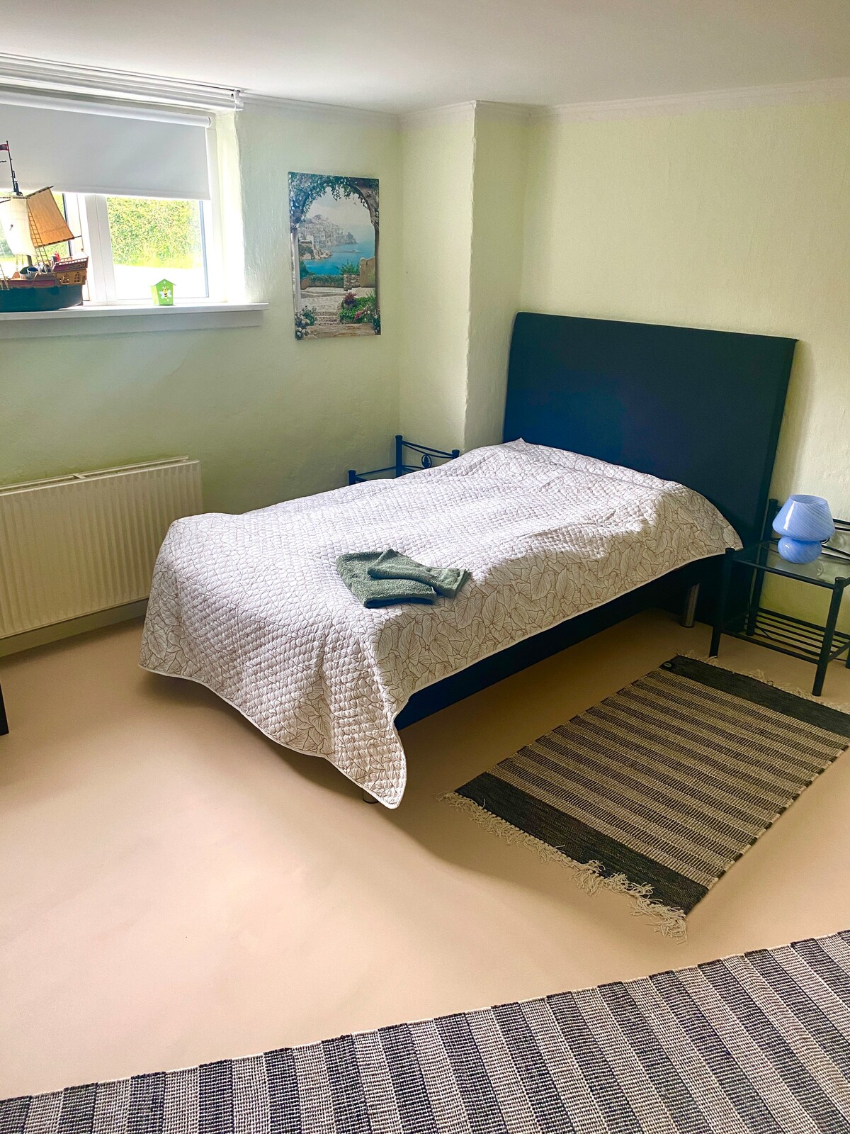 Both rooms have large beds . Green room has a three-quarter size bed and an extra guest bed and Gray room a double bed 160x200. Both rooms are equipped with furniture for clothes and have radiators.