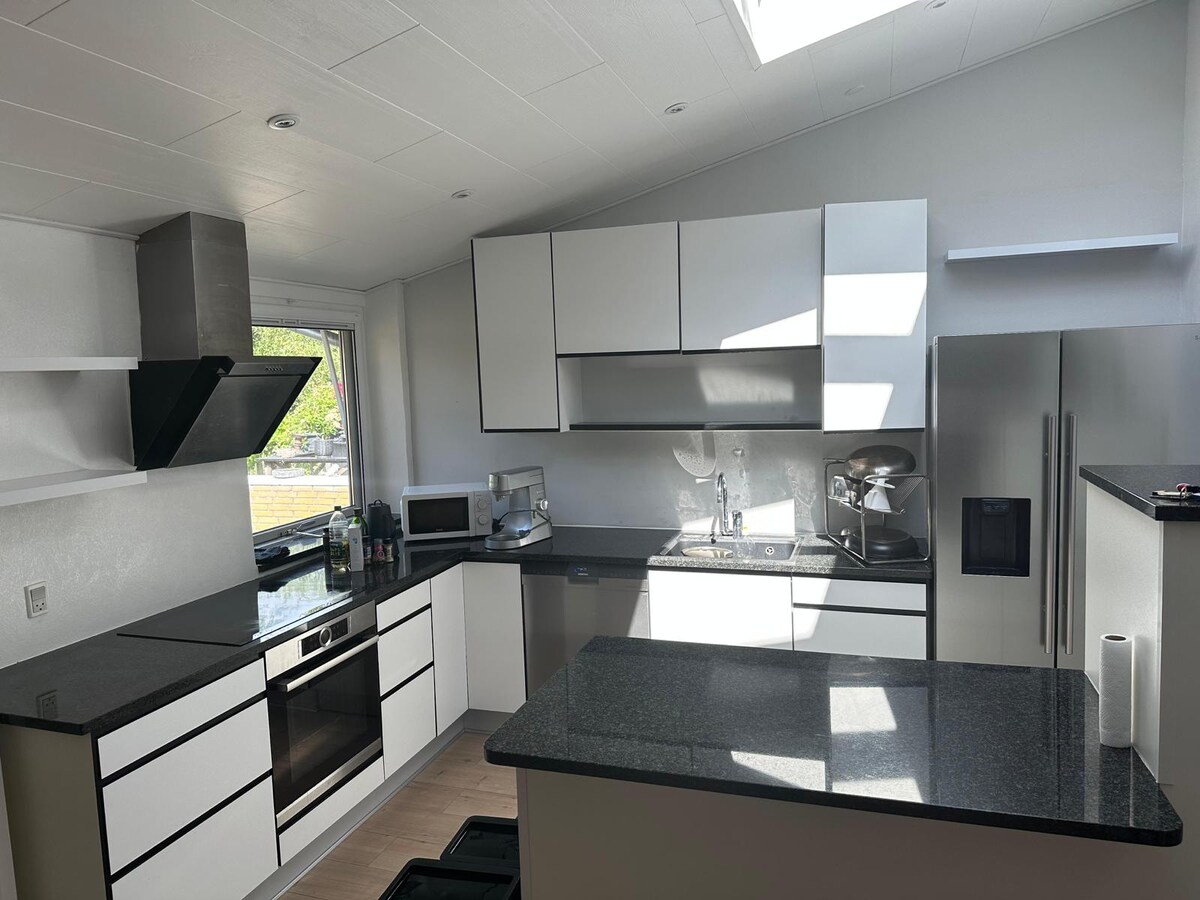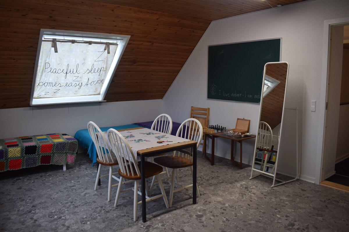 You will love my house because it is cosy, comfortable furnitures, wodden floors and fireplace. There are 2 bedrooms, you rent one of them and the rest of the house is common area. The house is perfect for vacation, businesstrip, families with children, couples and singles. Free parking right next to the house and no big steps. My house is close to bus and train. A dog may be with other guests. WiFi: 1Gbit/s.