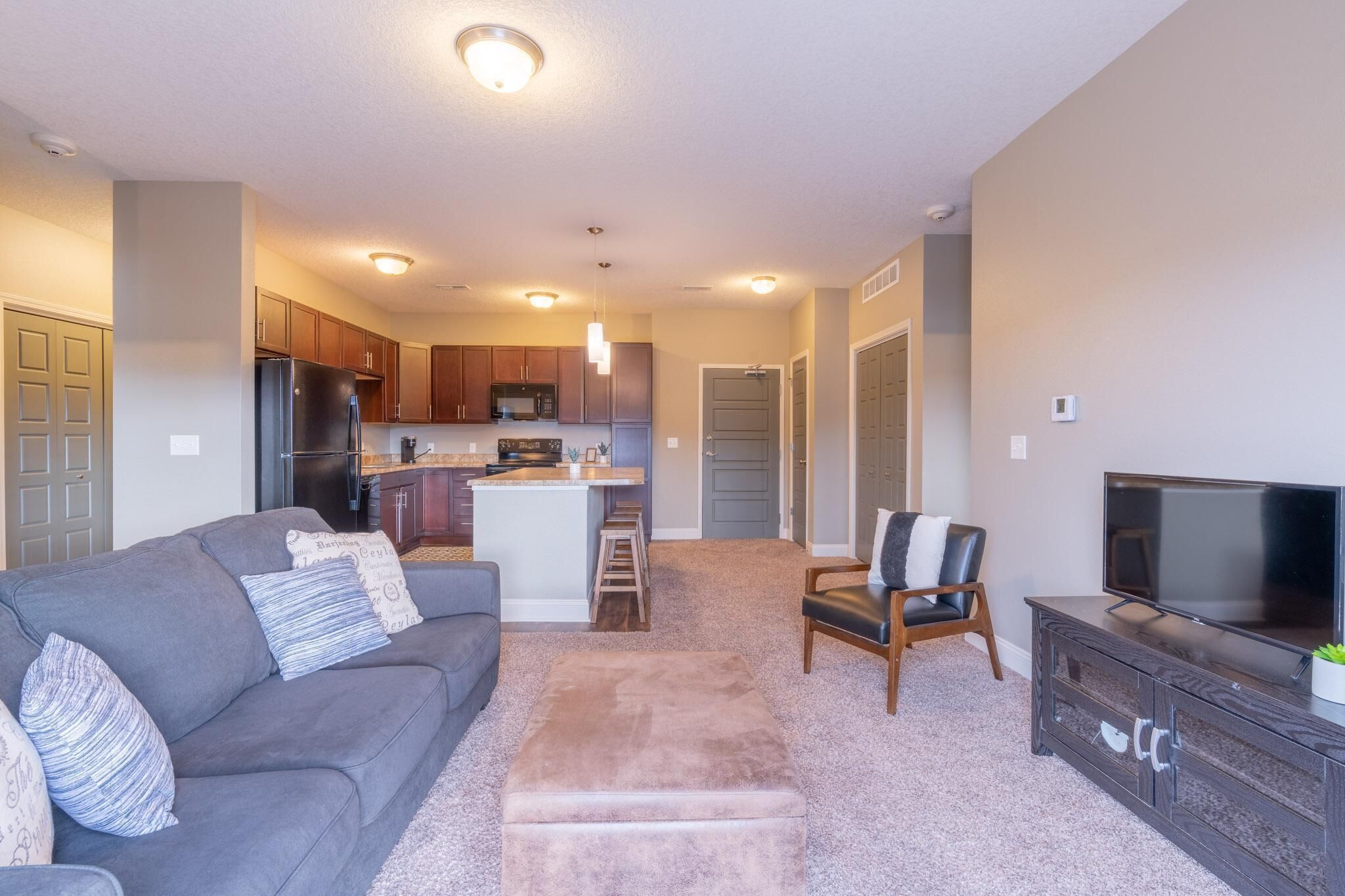 – Open-concept living & dining area with sectional + smart TV