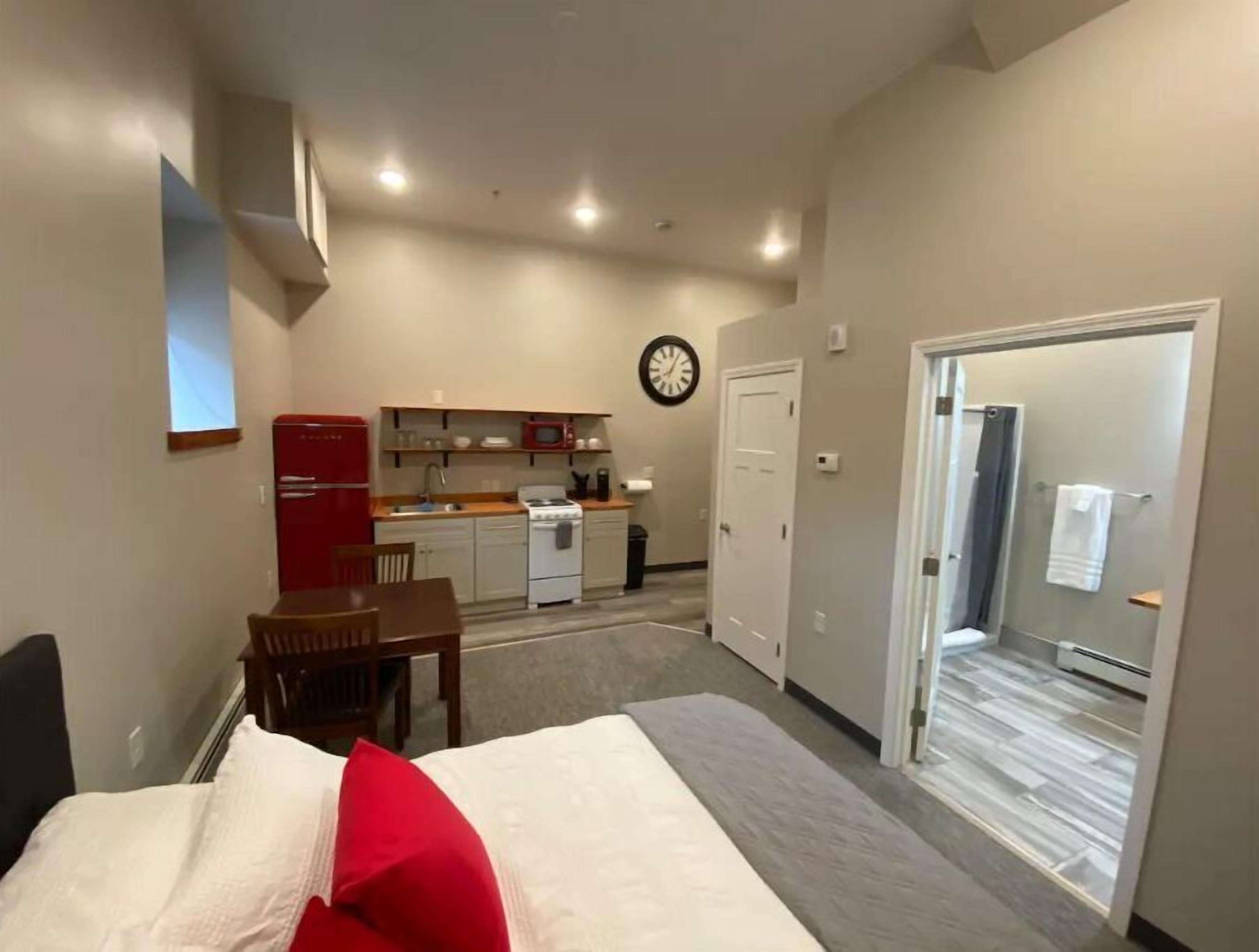 New extended stay hotel in East Duluth, a close walking distance to restaurants, shops, both hospitals and parks. This fully furnished studio suite features a kitchen, large bathroom, queen bed, all furnishings, free laundry and free WIFI. Fully updated with fire alarm system, carbon monoxide detectors, full fire sprinkler system, security camera system, and electronic keypad entrances. This unit features cream colored cabinetry, vibrant red appliances, closet space, and is fully handicap accessible .