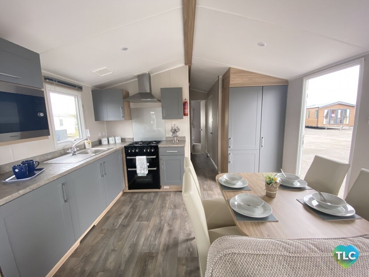 Located within Thurston Manor Leisure Park, this two-bedroom Sage Caravan offers great value accommodation with a modern interior and plenty of space throughout, making it the ideal choice for couples and families alike. There is an open plan living area with fixed seating, a TV and a dining area where you can enjoy family meals. The kitchen is fully equipped with cooker, small fridge, microwave, toaster and kettle, plus crockery, pots and pans.