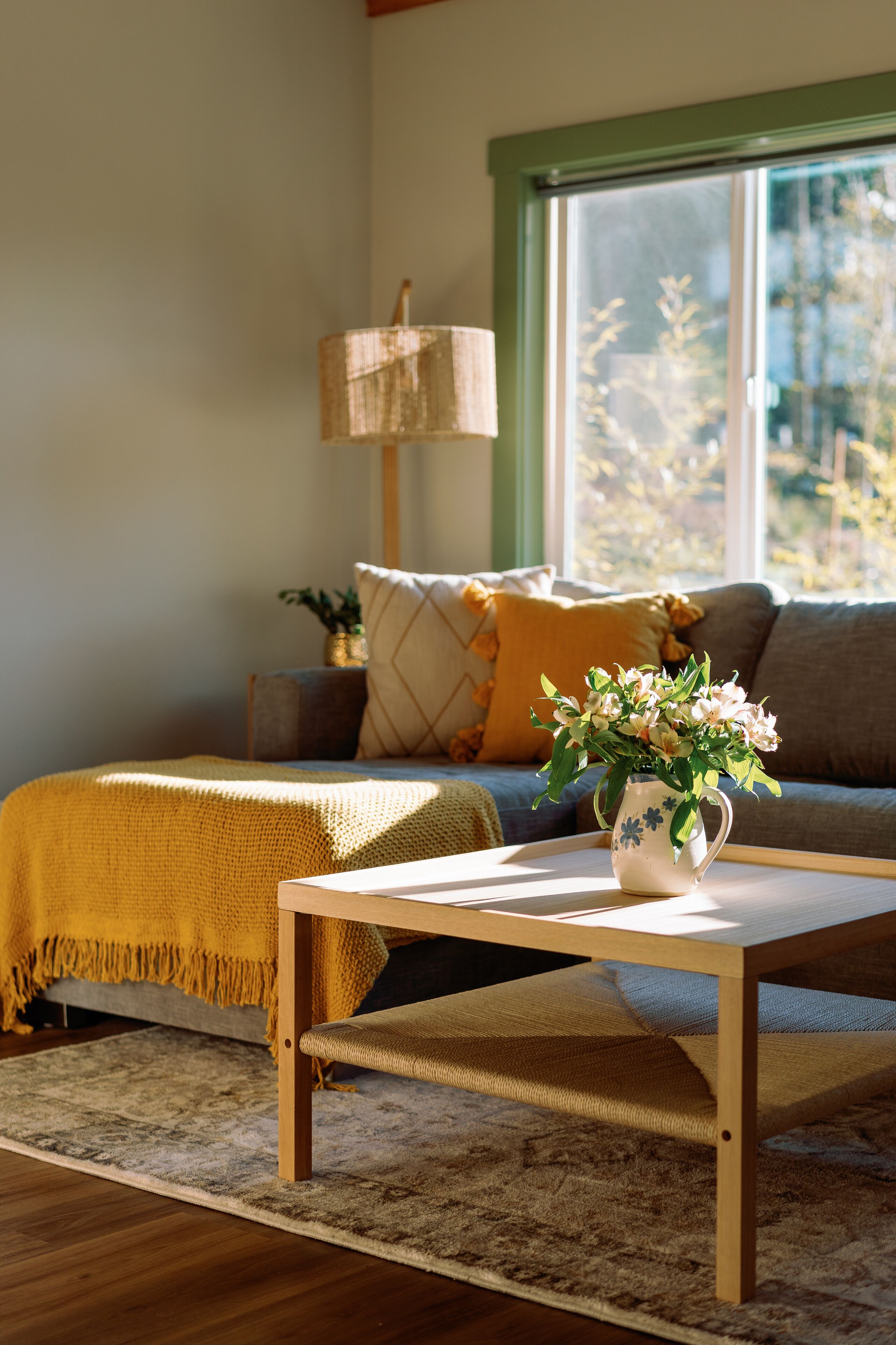 Our outdoor covered patio with a comfy feel and a bbq is one of the best features of our home. Hang out outside and cosy up by the fire table while enjoying the gorgeous ocean and mountain views!