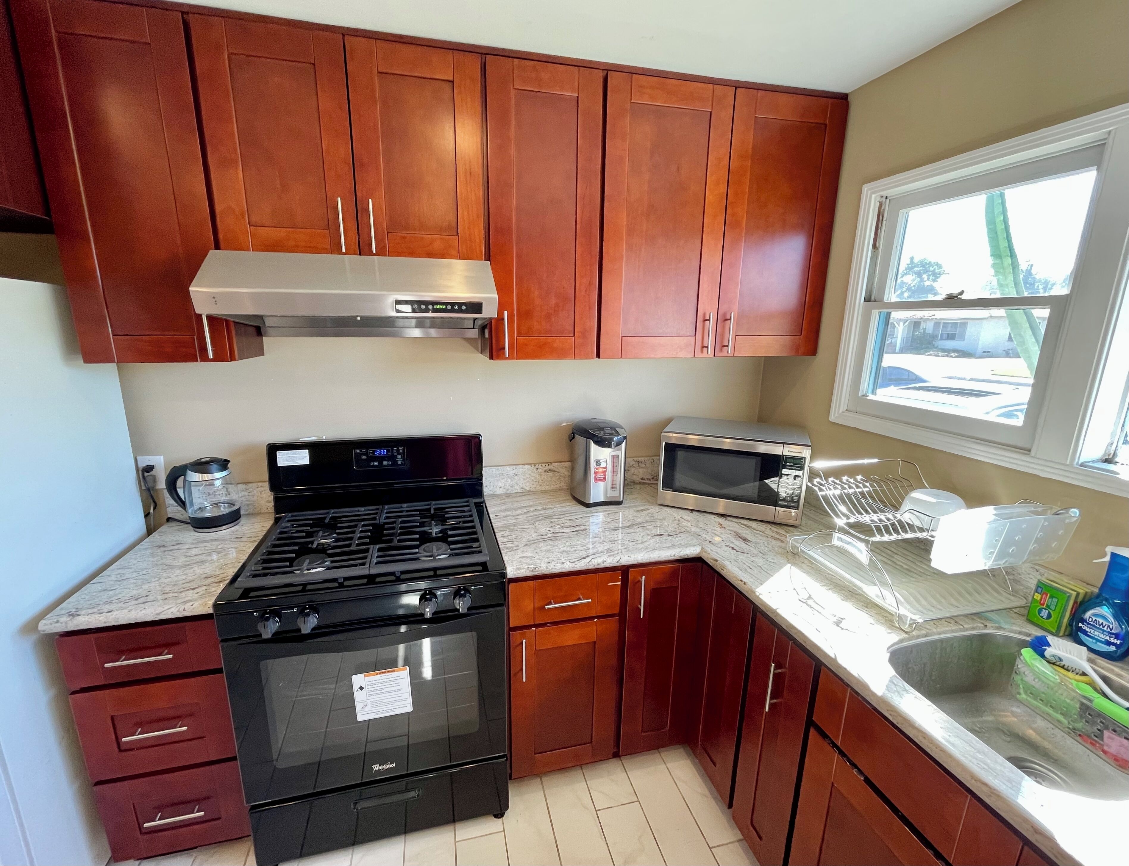 - The full kitchen includes pots & pans and essentials needed for cooking, a coffee maker, electric kettle, rice maker, and full fridge.