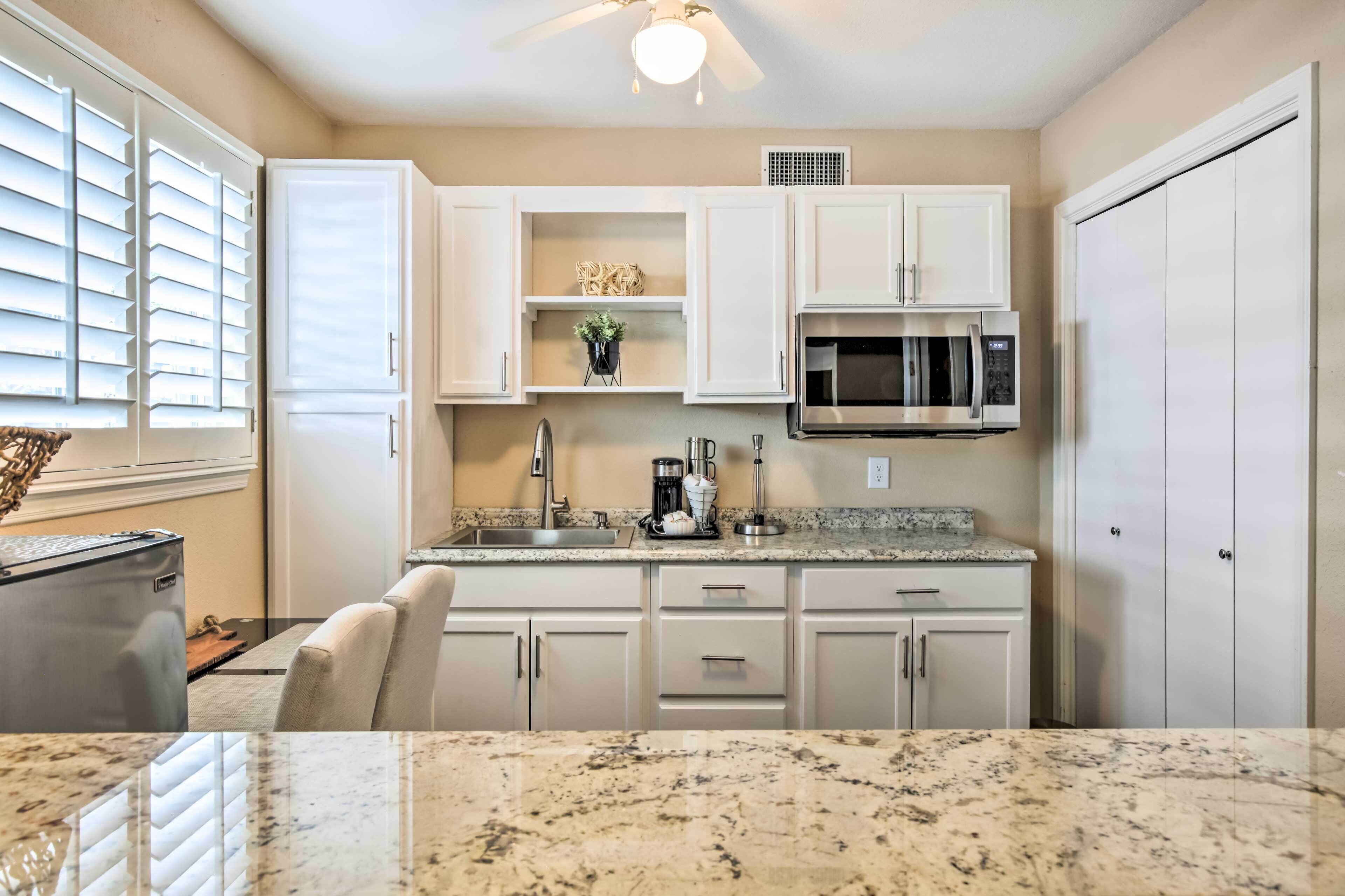 This vacation rental features air conditioning and a ceiling fan. The kitchen is equipped with a microwave, cookware, and a blender.