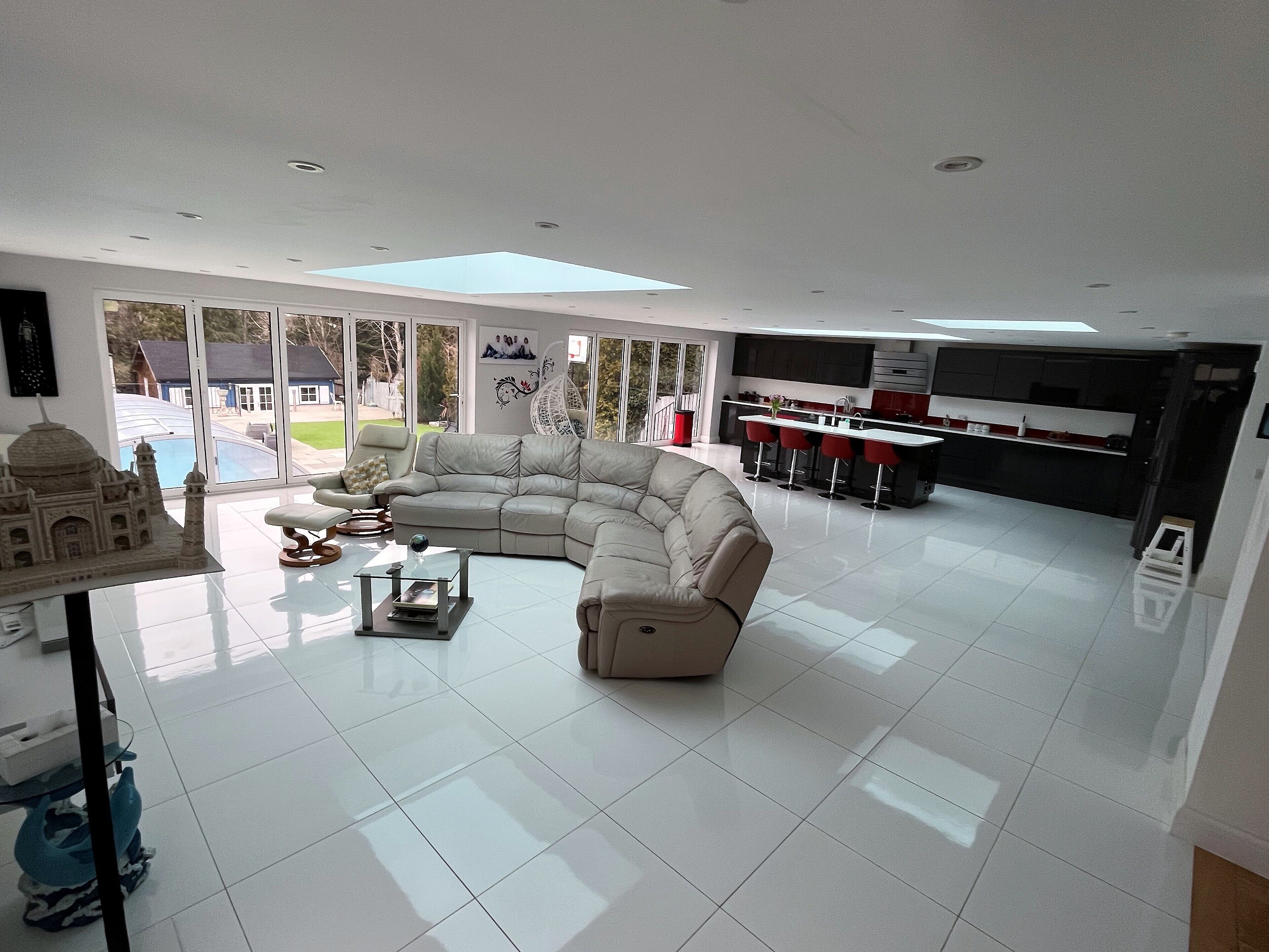 Contemporary modern 4 bedroom bungalow. Well furnished reception room with with large TV and white leather furniture together with a double sofa bed. There is also a large table & chairs. The room looks out through patio doors onto a south facing terrace and delightful garden with a bbq. The Kitchen has all new modern appliances including a 5 ring gas hob, double oven and dishwasher. A quiet holiday home in the suburbs yet all the attractions of London within easy reach. Not forgetting the excitements in store at Chessington World of Adventures for younger guests. Perfect for a self catering vacation in Surrey, England.