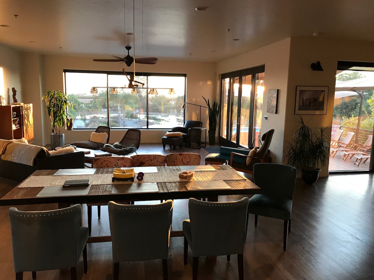 Guest love this floor plan with two bedrooms on opposite sides of house, with two bathrooms. An artistically designed Santa Barbara style home, looking out on large vistas surrounded by hills and wildlife. It is usual to see deer, wild turkey, quail, hawks, red winged black birds, owls, wild boar the occasional bears and much more. See photos for views.