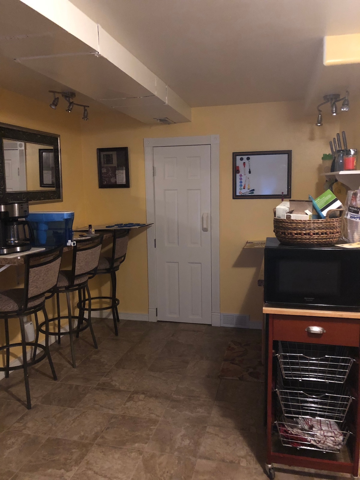 Our home has 5 bedrooms in the basement of its south wing. We provide a simple private room with a key lock. Aside from the private room guests have the entire South wing to share including its one and a half bathrooms, kitchen with its cookware and color coded dishes for each room, dining room, and our spacious living room with books, tv, comfortable seating, and abundance of natural light. If you have a vehicle there is plenty of off street parking with electrical outlets on the Northside of the house facing College Rd. Our house is over 70 years old and has things like water damage from the 1967 flood, dated color schemes, and much more. Fashionable resort seekers will be disappointed.