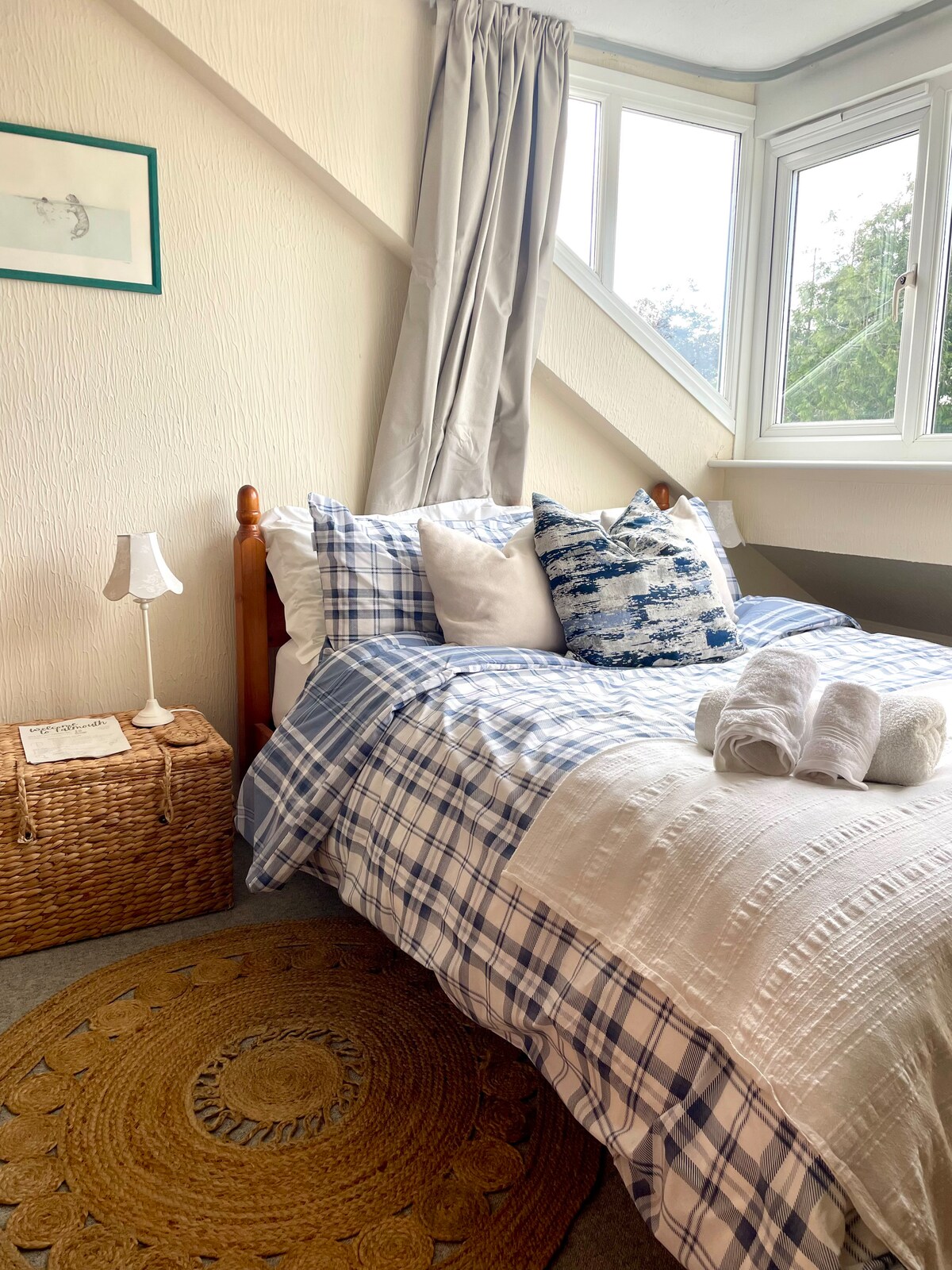 Your stay will be in a cosy twin room in the attic of a charming townhouse by Kimberly Park in central Falmouth.