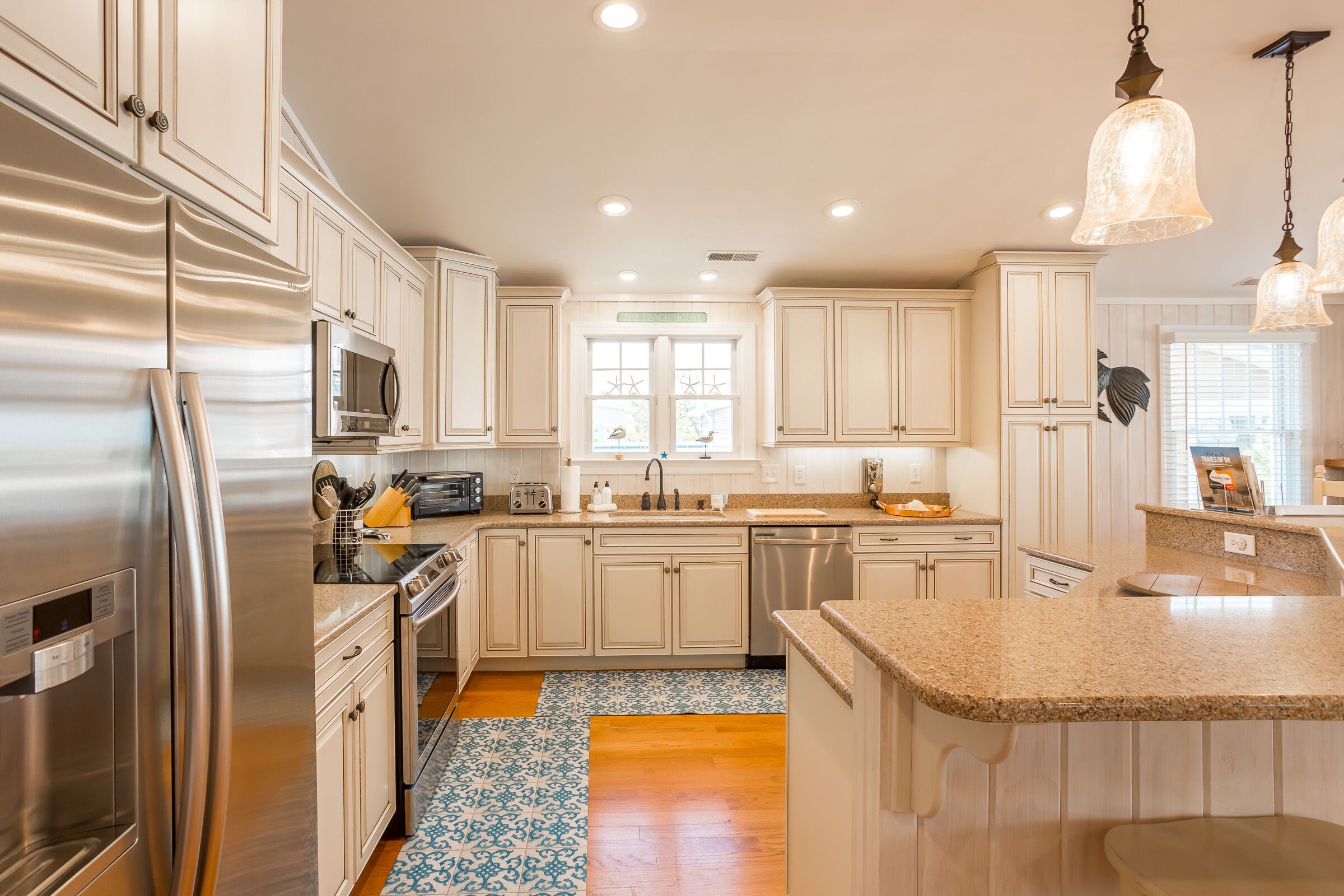 For the chefs, Island Time features 3 fully equipped kitchens with stainless steel appliances, granite countertops and gas cooktops. Most places on the Eastern shore have electric cooktops. We also have a large electric griddle for making perfect pancakes for your group, a waffle iron for our guests to enjoy, a 6 quart crockpot and a large 6 burner gas grill outside.