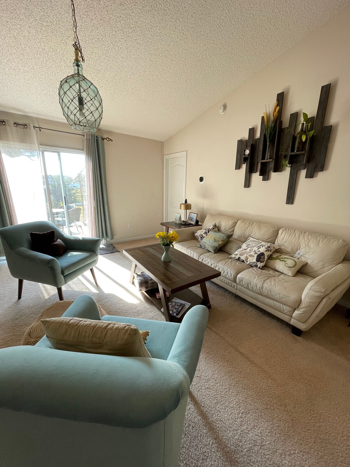 This is a spacious, bohemian inspired, 2 bedroom 2 bath, with 2 king beds, on the bottom floor of a duplex. Two roll away beds makes it a 6 sleeper.