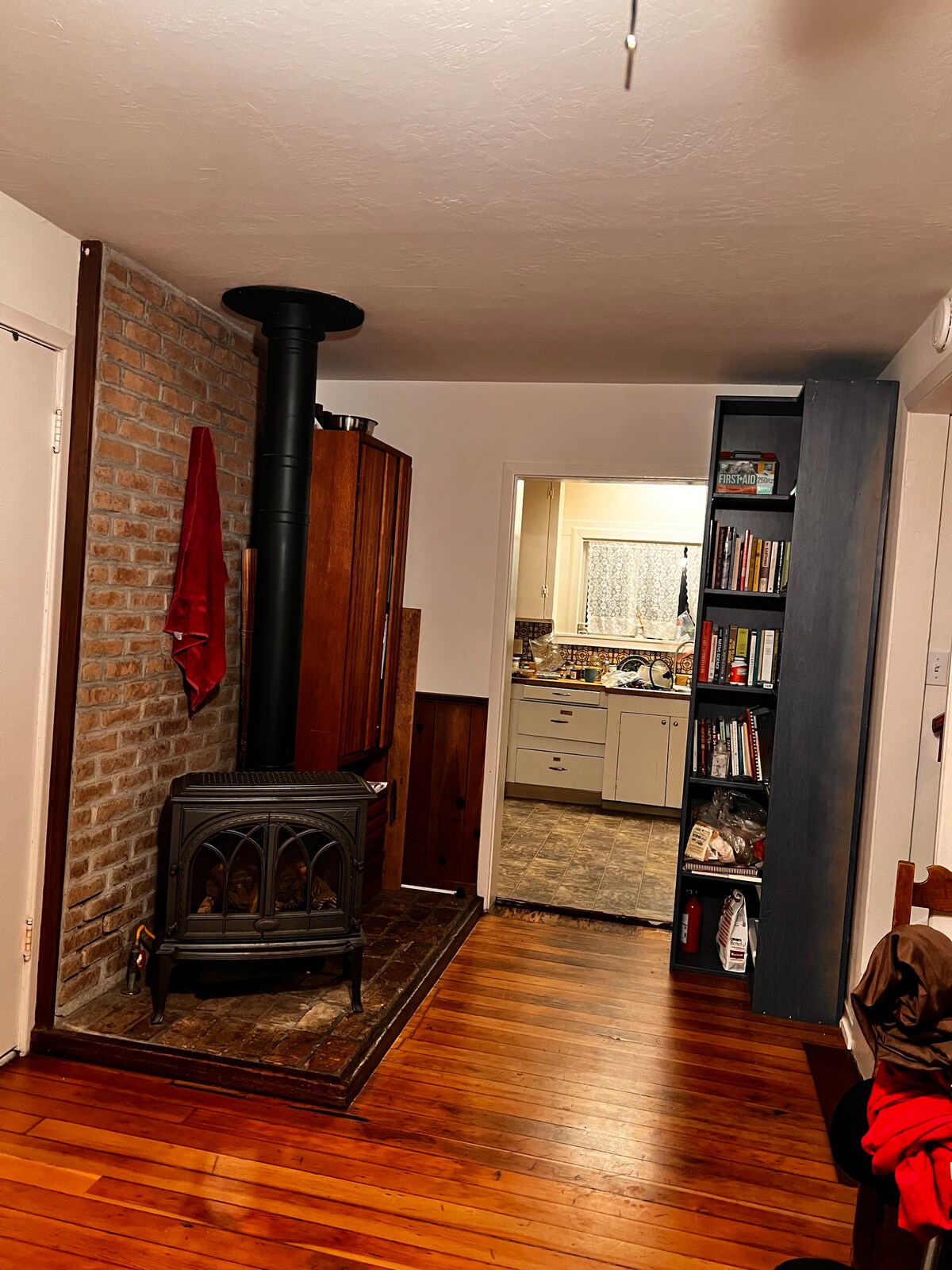 Willow Cottage @ Barte Woods has a long history. The woods have been in our family since 1933, and the guest cottage has been expanded four times through three generations! The cottage has a living/dining space with cute wood stove (wood provided), smart TV, comfy loveseat sofa, armchair and dining table. The well equipped kitchen has the handmade cabinets from the very first cabin on the property, and includes modern conveniences of a full size fridge, gas stove and microwave.