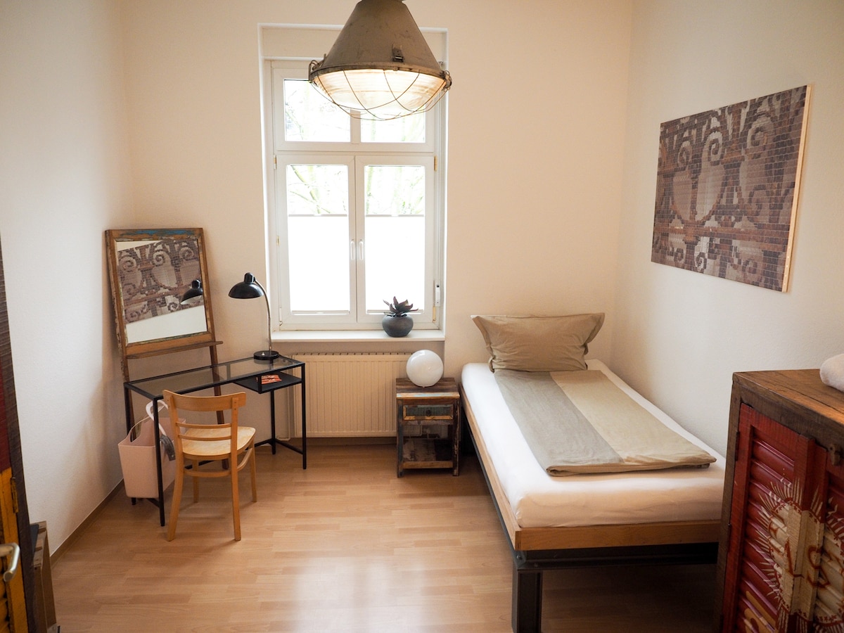 You will live in a renovated old building in a bright room tastefully furnished in vintage style. With other flatmates you will share kitchen and bathroom - both newly renovated.