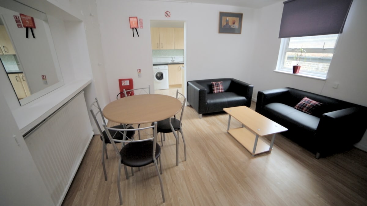 The kitchen has two stools and a small shelf which can be used to eat at, but there is no living space or TV. Hopefully you won't miss this, as there are so many great places nearby to eat or drink!