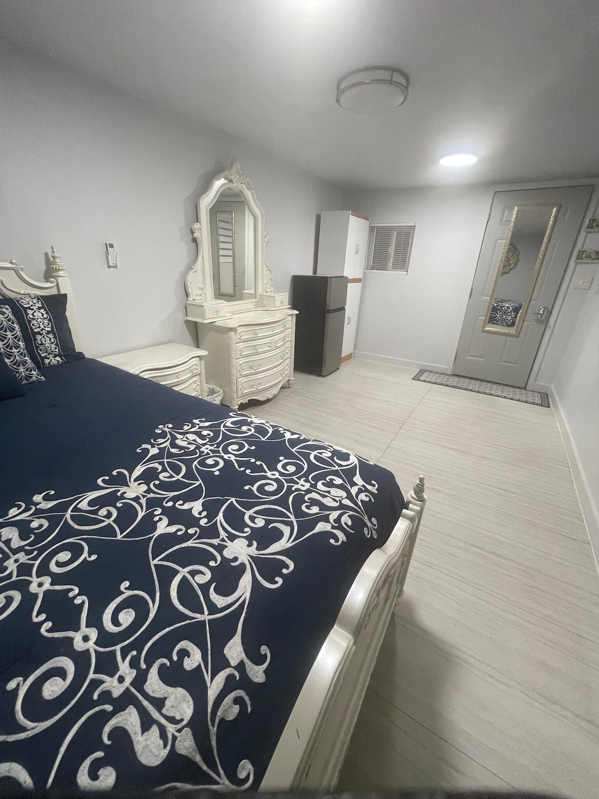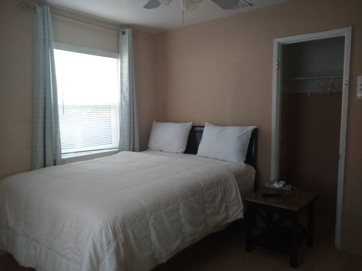 This room is at the far end of the house opposite of the kitchen and bathrooms. This is an important feature to note if you want to be right next to those areas. Message us and we will let you know if we something that will better accommodate your needs. Guests love this room because of how spacious it is. The room has a new Hotel Inspired KING size Sterns & Foster mattress with a medium soft gel foam topper, fresh clean sheets & pillows. There is a TV, Microwave, and kitchen cart in the room. You also have a PRIVATE dining table with bar height leather chairs so you can enjoy a wonderful dinner in a space you can truly call your own.