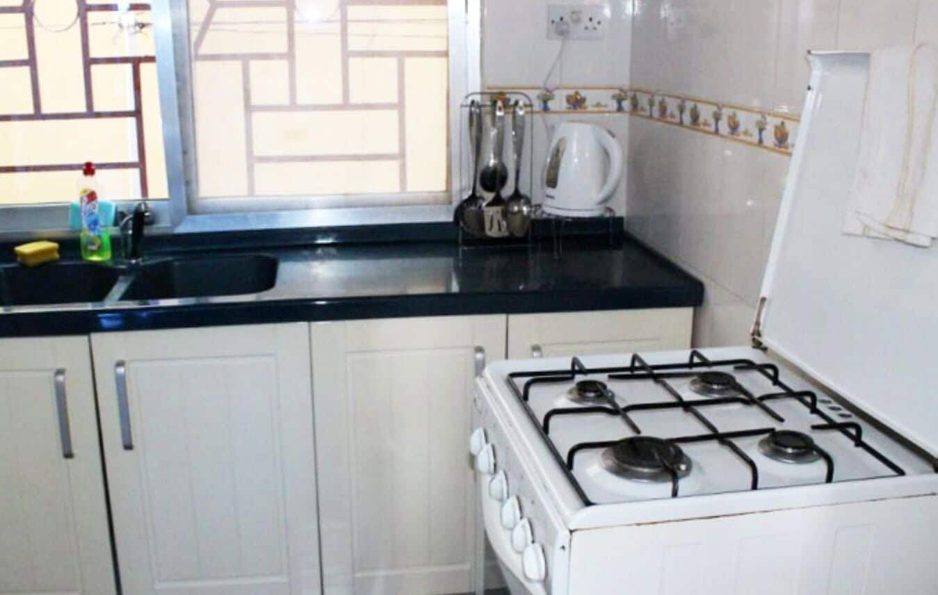 The kitchen is fully equipped with a gas stove and fridge-freezer combination