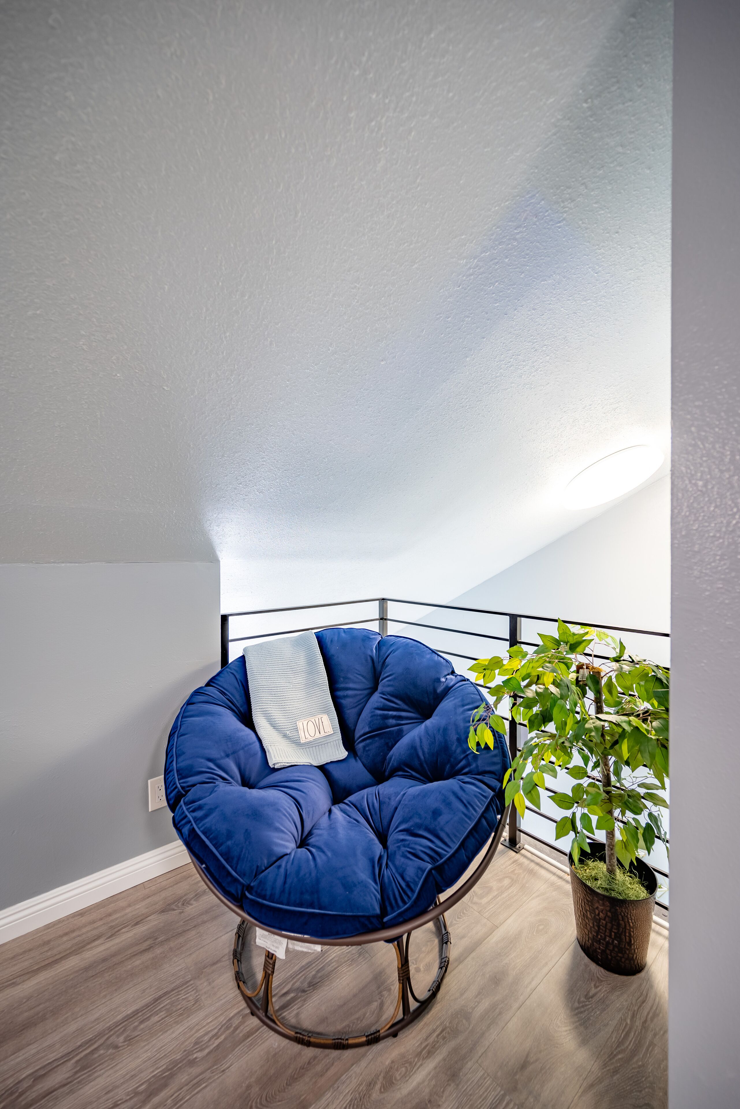 The room is cozy and fully equipped with one full size bed, bathroom right next to it. We also provide necessary amenities for the guests for comfortable living space such as high-speed wifi, kitchen, etc. On second level.