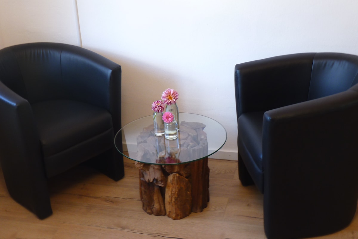 The beautiful round table with the two comfortable armchairs round off the picture, as well as the blind to darken.