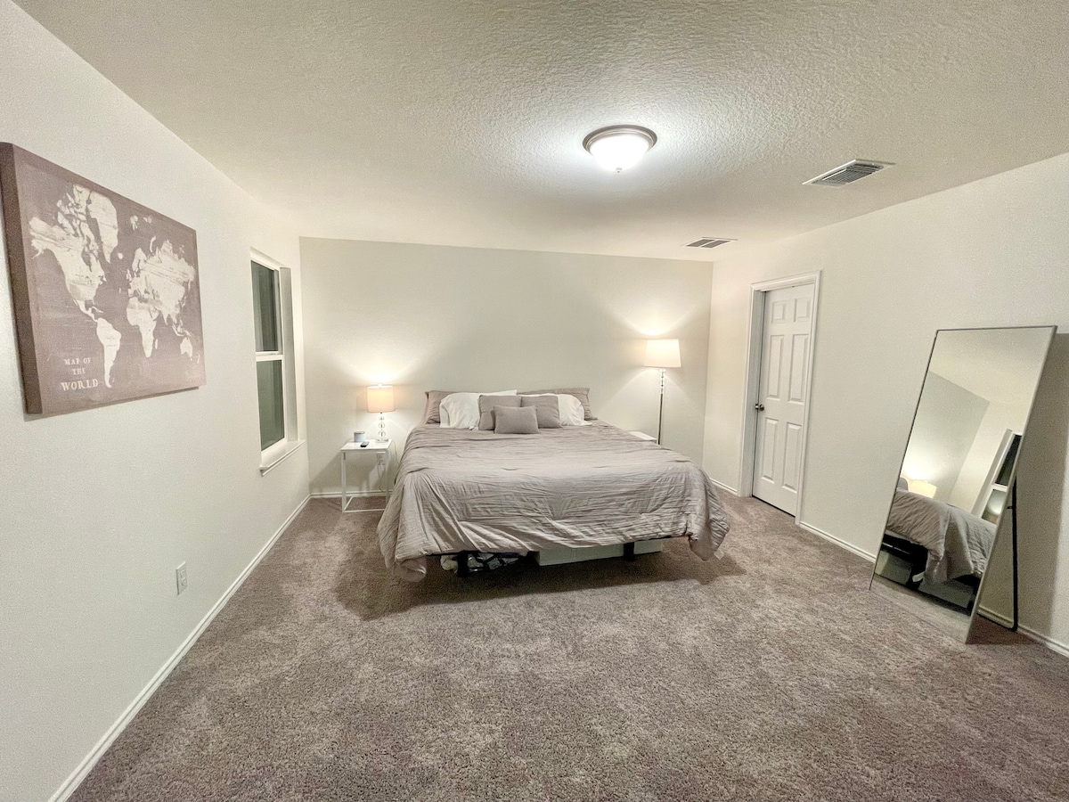 Brand new 2-story home with multiple living spaces. Other guest may be occupying other rooms and sharing spaces. The room is very large and can fit an air mattress on the floor (not provided). New King size bed can sleep 3, and 2 on an air mattress (not provided).