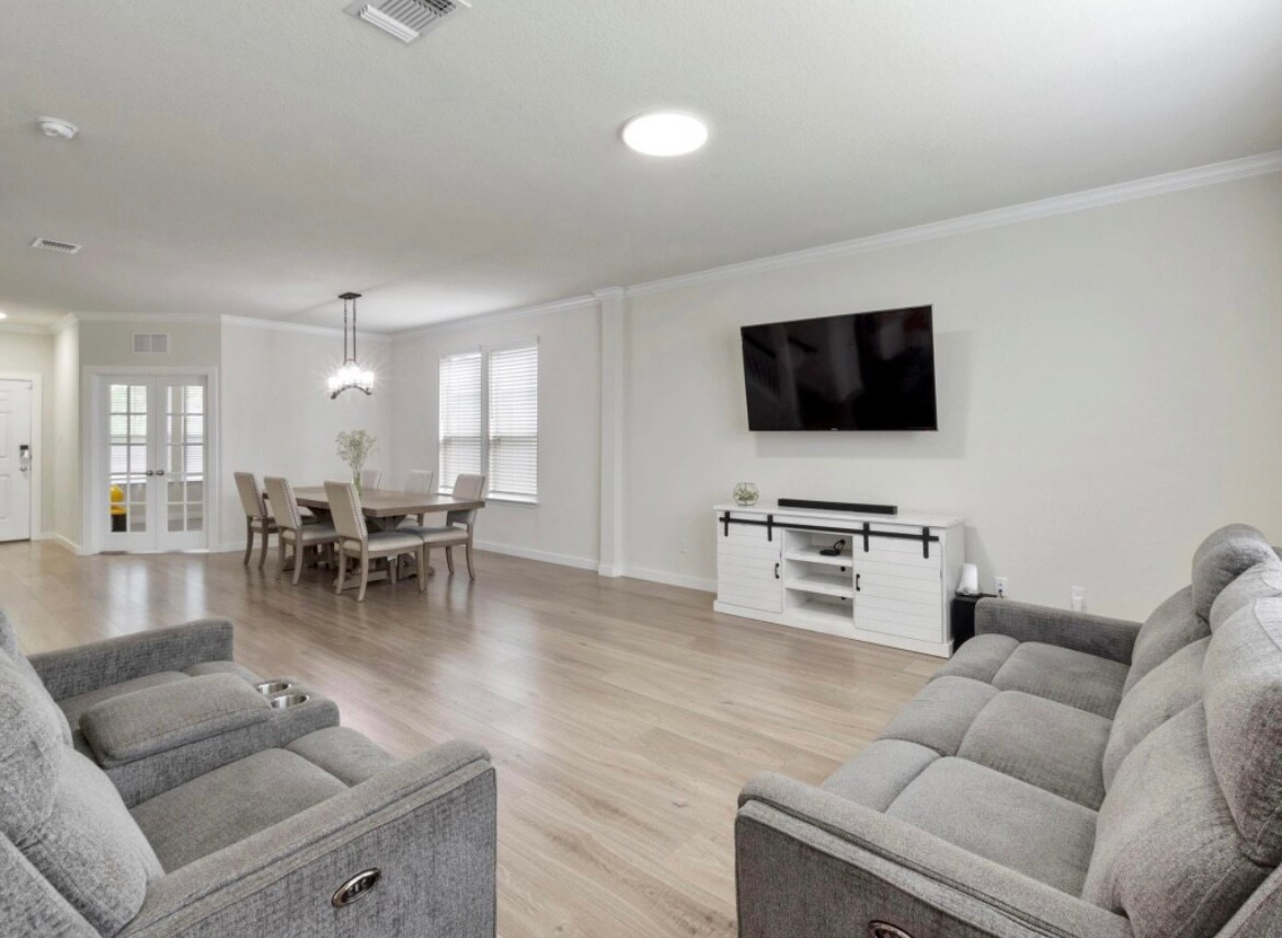 This thoughtfully designed home features a bright open-concept layout that connects the kitchen, dining area, and living room to the outdoor patio and pool… perfect for groups who want to stay connected while enjoying their own space.