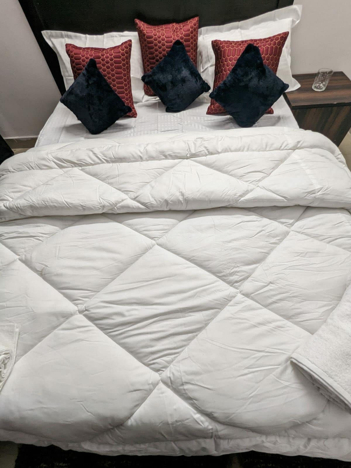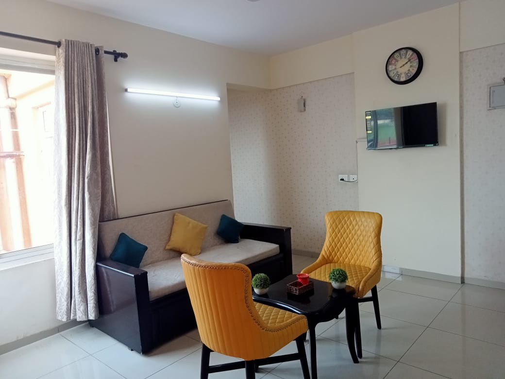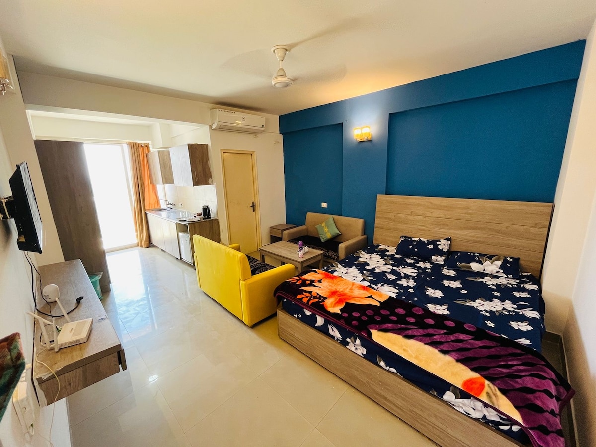 Complete and compact 1 bhk apartment within secure and clean township of renowned wave city. Has a king sized large bed plus large sofa bed in the living room. Fully functional kitchen with refrigerator, stove and utensils. Tv and wifi available. A total of 3 similar apartments available in same building. Room is Airconditioned