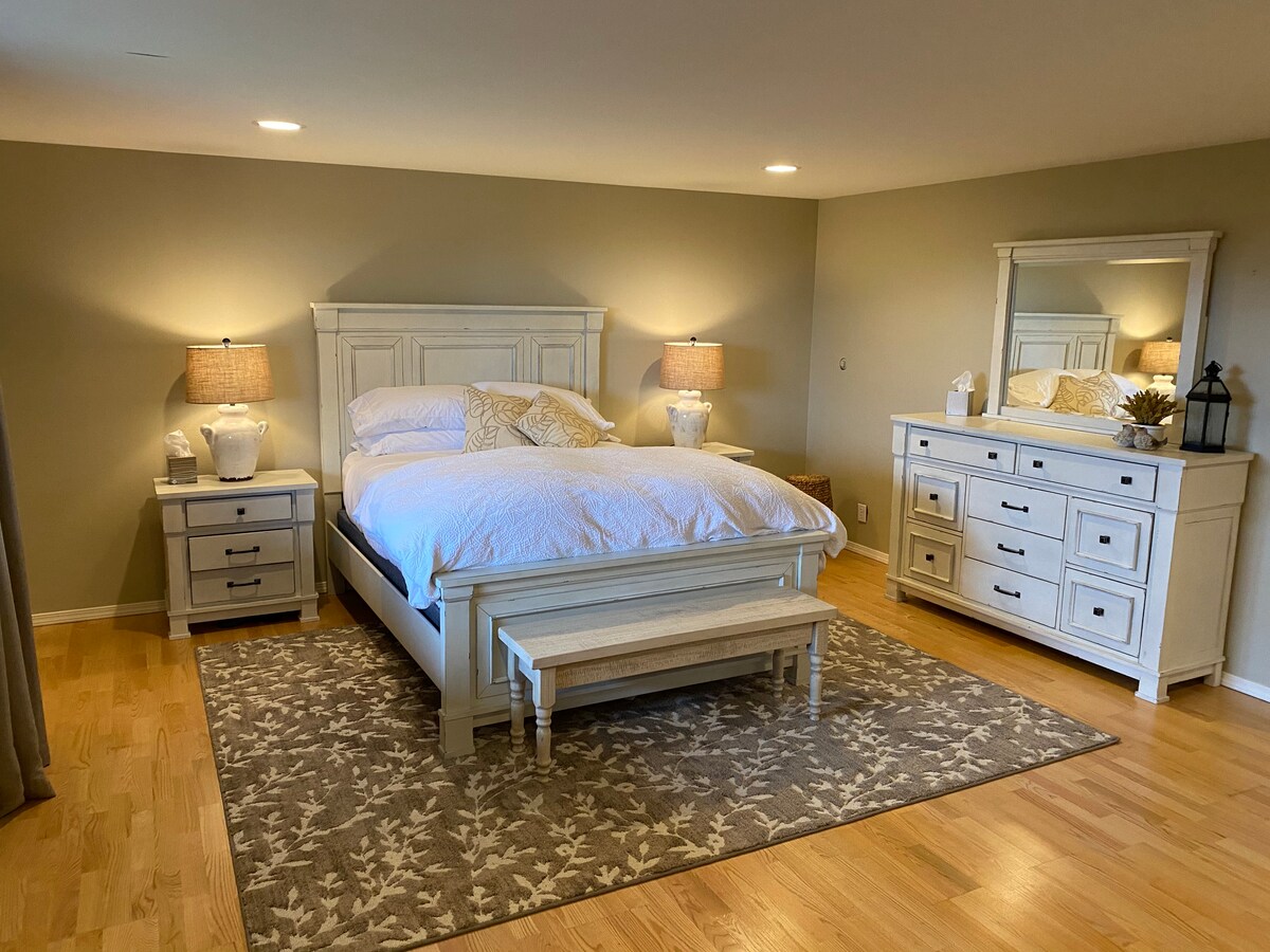 You are invited to stay at this charming upstairs 2-room private suite in my cottage home. Receive a breakfast snack in the morning. The roomy suite includes a bedroom, en-suite bath and study. The study has a desk, TV, and a place to relax. Enjoy the comforts of freshly ironed 100% cotton sheets, high quality bedding and fluffy towels. Great and convenient location between “The Harbor” with waterfront dining, quaint shops and the “Uptown” area for shopping or medical appointments.