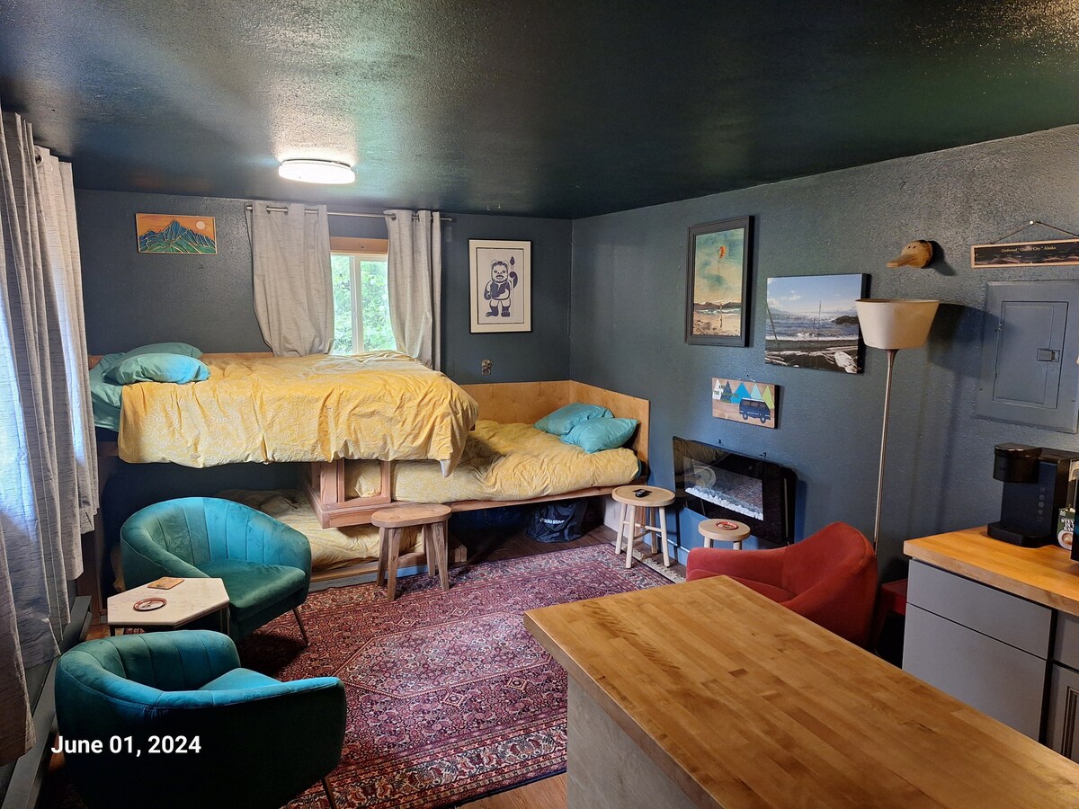 The private studio at Alyeska Hostel has a private bathroom and a kitchenette. This spacious room includes a queen bed, a full size convertible couch and a table with chairs. The entrance is also private. The kitchenette includes mini fridge, coffee maker, toaster, microwave, sink and dishware. Note that there is not a cook-top. The private bathroom includes a shower, toilet and sink. This property is 3 years old.