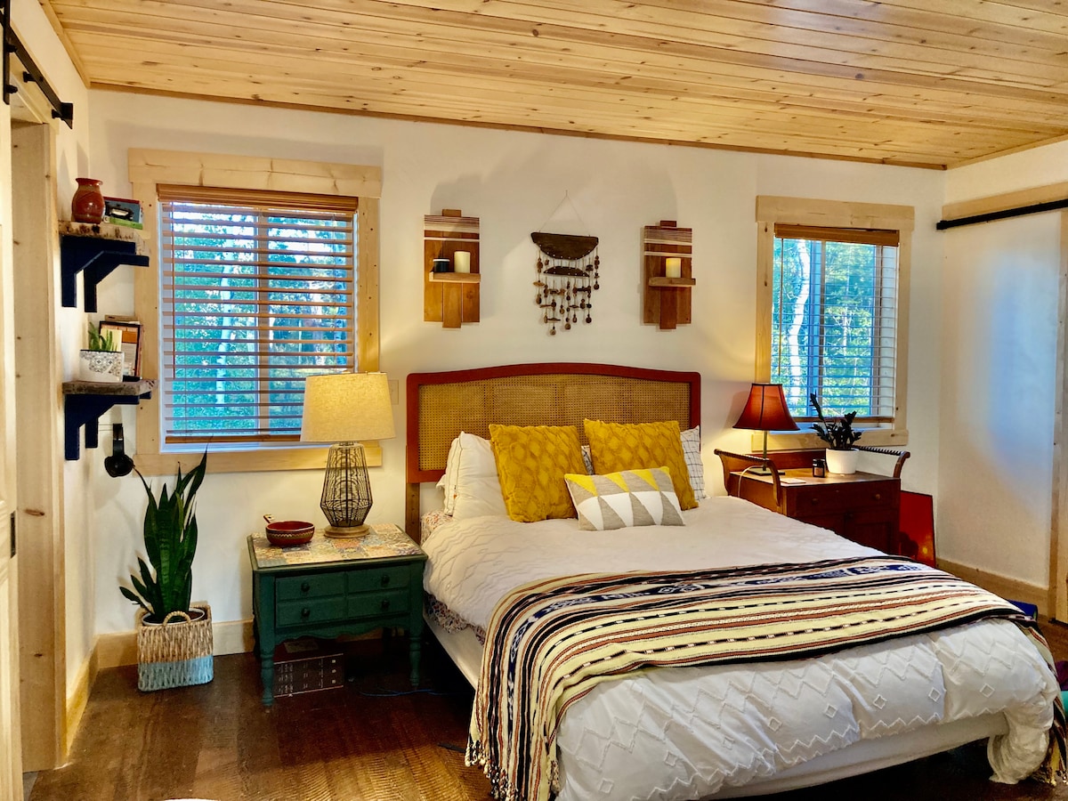The elegant yet rustic interior has hardwood floors and reclaimed wood stairway. There is a Queen bedroom upstairs with half bath and a loft area with a full futon to sleep two more. Downstairs is a Queen bedroom with a full bathroom. There are a washer and dryer on the main floor, as well.