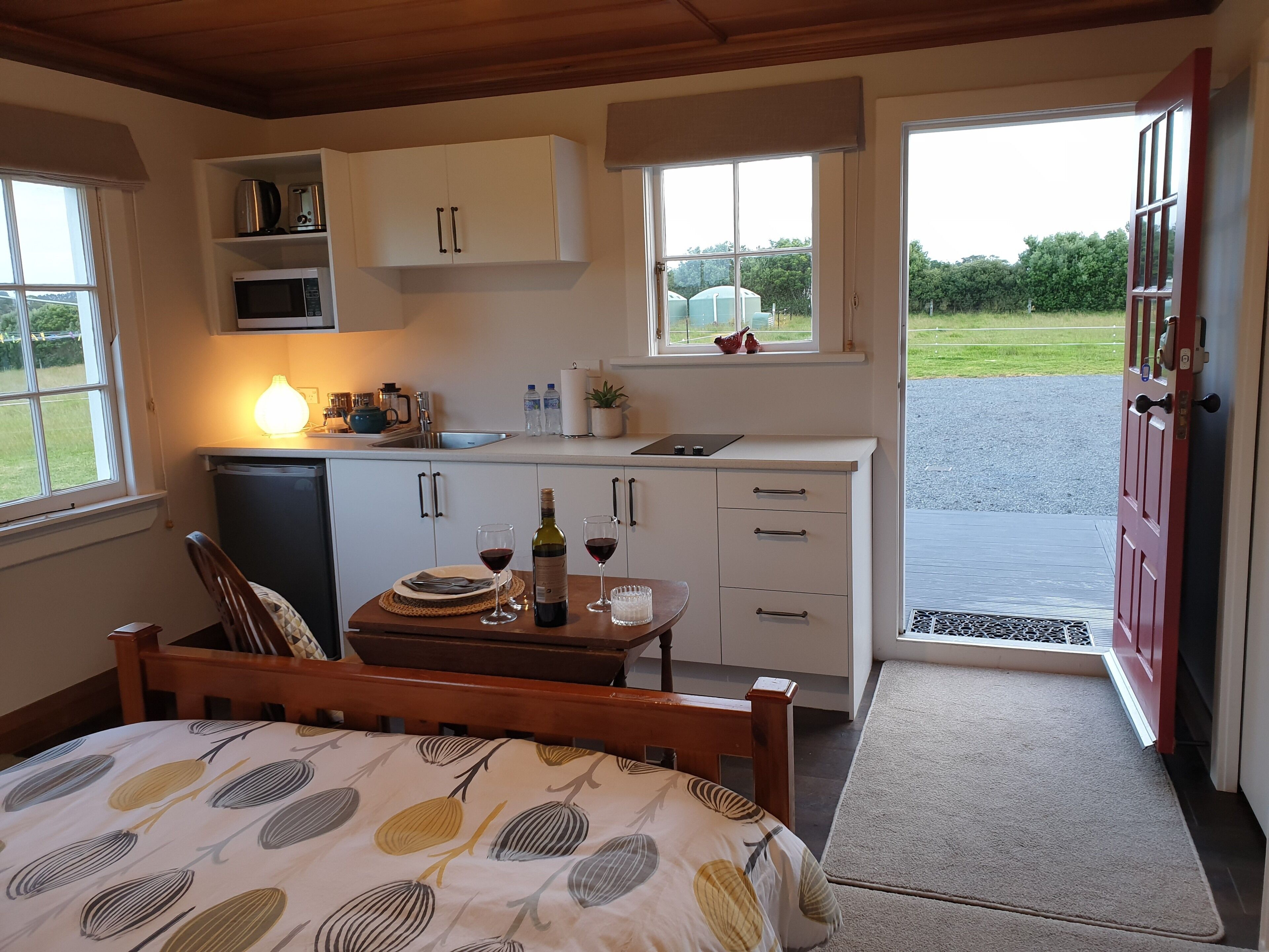 You've got exclusive use of a two-room suite. It comprises a bedroom, a living room (which can double as a bedroom using the comfortable sofa bed), a bathroom (shower over the bath), a separate toilet, and a separate small kitchen/laundry.