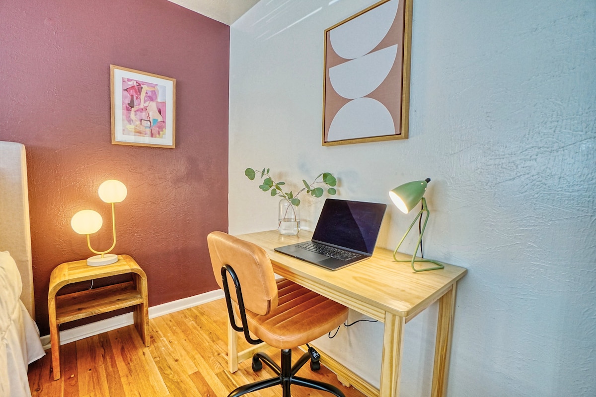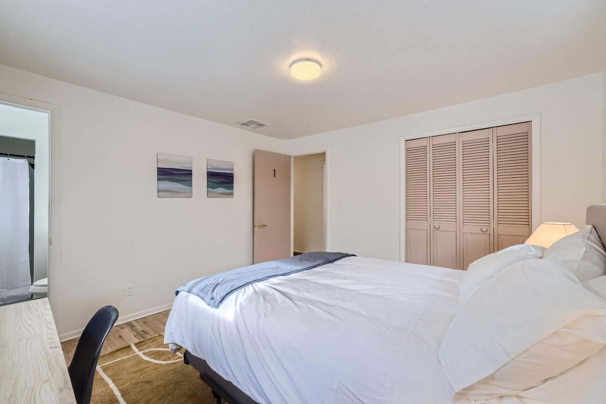 Unwind in this stylish upper-level private bedroom, designed for both relaxation and productivity. Enjoy a plush queen bed, a chic workspace, and a spacious closet, perfect for travelers, professionals, and extended stays. Whether you’re winding down after a day of adventure or catching up on work, this space feels like home.