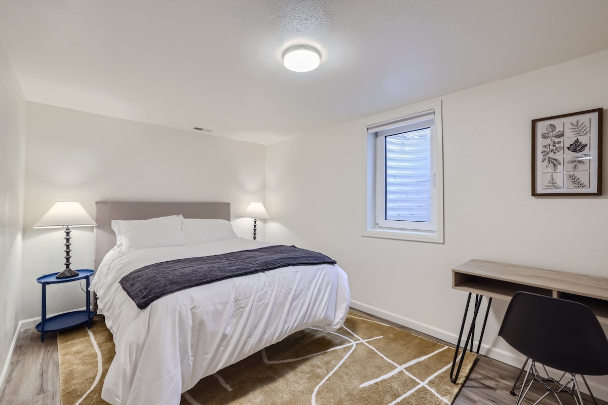 Unwind in a private bedroom located on the lower (basement) level, thoughtfully designed for both comfort and productivity. Featuring a plush queen bed, a dedicated workspace, and a spacious closet, this room is perfect for travelers, students, professionals, and extended stays. Whether you’re relaxing after a day of exploring or catching up on work, you’ll feel right at home.