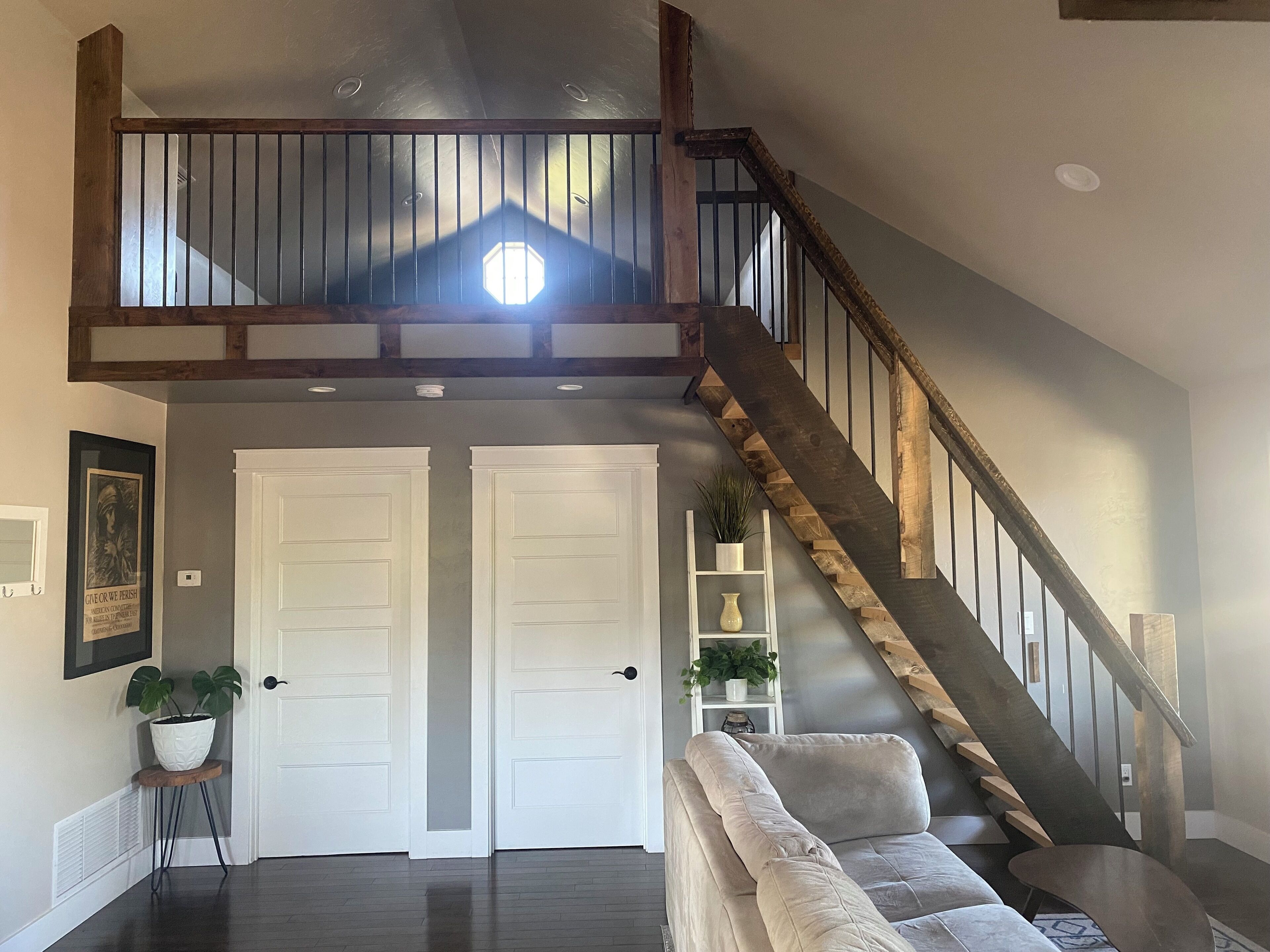 The Perch is located on our 100-acre private ranch, where guests have access to the trails across the main property, to the ponds, river and riverfront, and also the 1500 sq ft deck and screened gazebo down at the river (subject to availability) . The space is fresh and bright, providing a year-round, comfortable and relaxing environment. Stay, enjoy the company of friends and family, and unwind in a natural and tranquil setting. The Main Bedroom has a King that can be split into two Twin XLs and another door for direct access to the covered patio. The Bunk Room has two Bunks (Twin XLs, with reading lights and curtains for privacy) and includes a sofa and TV . The Bathroom has a walk-in shower, sink and WC. The open plan living area includes a full kitchen (with ice-maker fridge-freezer), comfortable lounge area and dining table for six. The Perch has a large covered patio, with a BBQ, dining table, and fantastic views of Mt. Garfield and out across the hay fields down to the river. We also have an indoor storage area for bikes, kayaks, paddleboards and any other toys you'd like to bring with you.