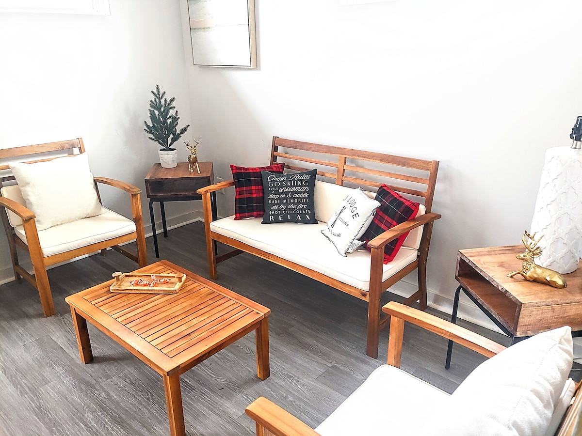 Downstairs you will find a large living room (with queen pullout couch) and open concept dining space, with plenty of space to socialize, have meals, and entertain. Pass through the dining area to a fully stocked kitchen with a coffee bar which also attaches to a spacious laundry room. You will also find a large bathroom with a tiled shower and extra toiletries to fit all your needs on the first floor.