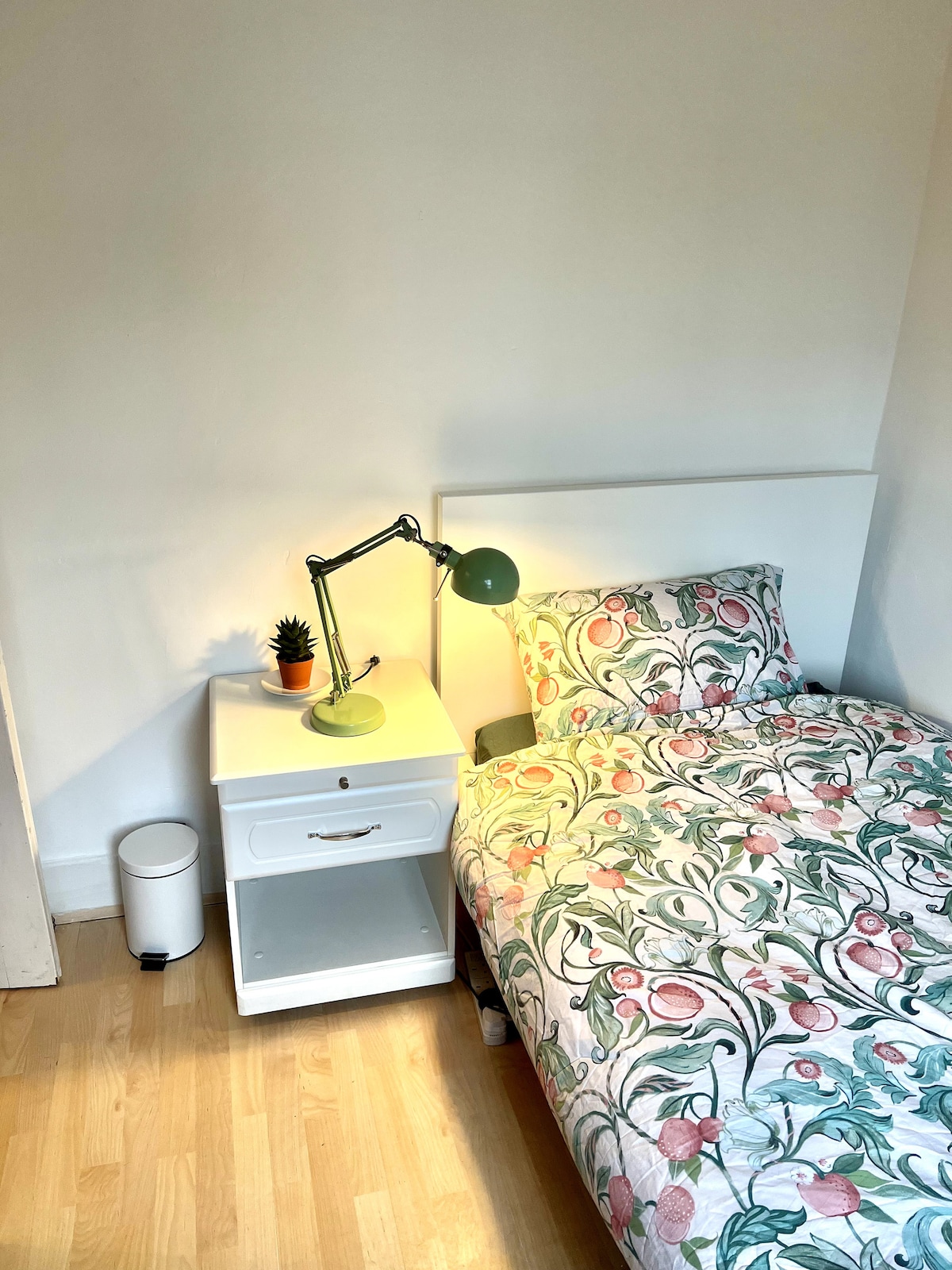 Cute sunny single bedroom for female with single bed, side table & lamp, large wardrobe and storage baskets, hanging ceiling lamp and large window with Venetian blind. Shared toilet, bathroom and kitchen. Must be comfortable living in a non-smoking household with a family. The room is on the first floor in a Victorian house with multiple staircases.