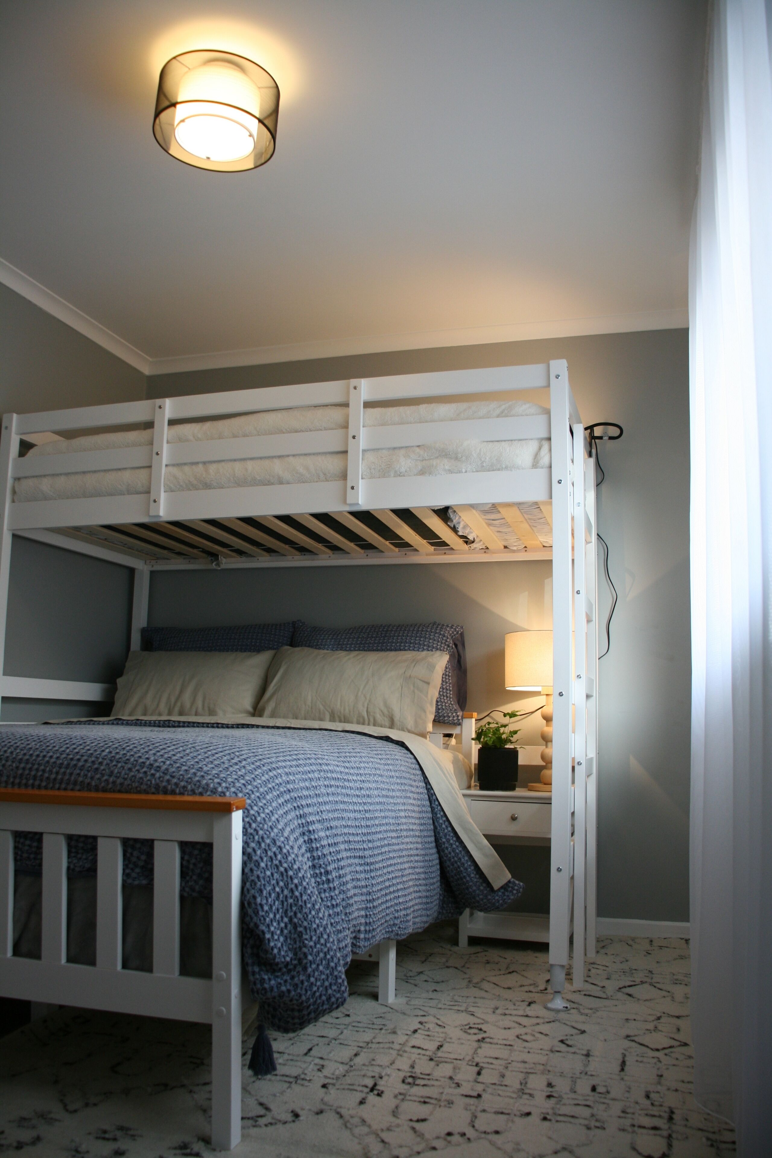 One bedroom features a queen bed, the second single bunk over double so perfect for families or two separate travellers. Both bedrooms have a generous wardrobe.